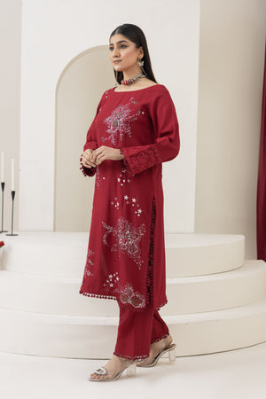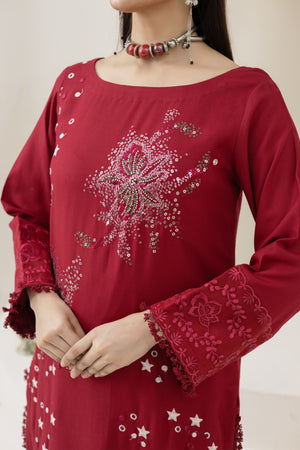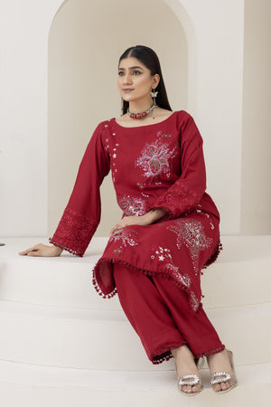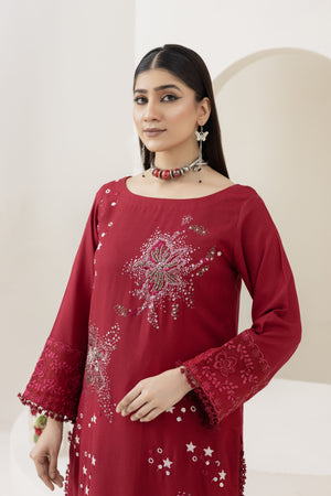 Turn heads with this striking Hot pink Dhanak 2-piece ensemble, designed to bring elegance and charm to your festive wardrobe. The straight-cut shirt is beautifully adorned with intricate mirror and sequin embellishments, forming floral and star patterns that sparkle with every movement. The delicately embroidered sleeves, finished with lace and tassel detailing, add a graceful touch to the overall look.