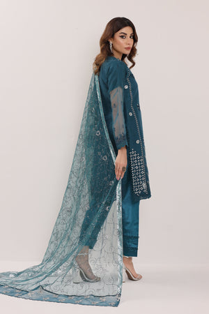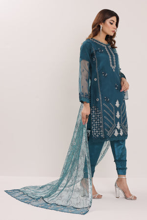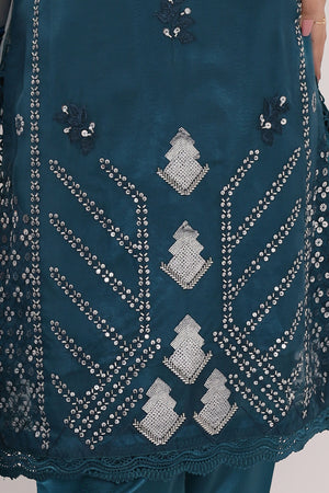 Drape yourself in teal-blue elegance with this luxurious organza attire, designed to exude sophistication and charm. Adorned with exquisite embroidery and intricate machine embellishments, this ensemble is a true statement piece. The sequins-embellished net dupatta adds a touch of ethereal beauty, while the wider Katan silk trousers ensure a refined and graceful silhouette.
