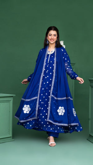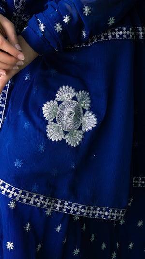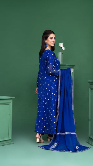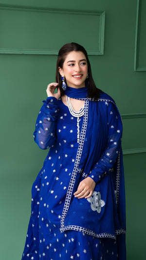 Make a regal impression with this royal blue 3-piece set , designed to capture timeless grace with a modern twist. Crafted from premium chiffon, the beautifully embroidered flared silhouette flows effortlessly, offering a blend of elegance and movement. The matching chiffon dupatta adds a graceful layer, while the attached slip ensures comfort and coverage. Ideal for festive gatherings or party occasions, this outfit brings sophistication to every season.