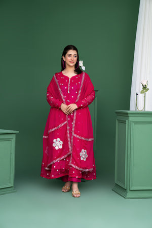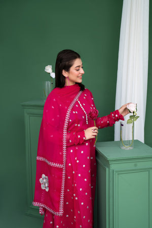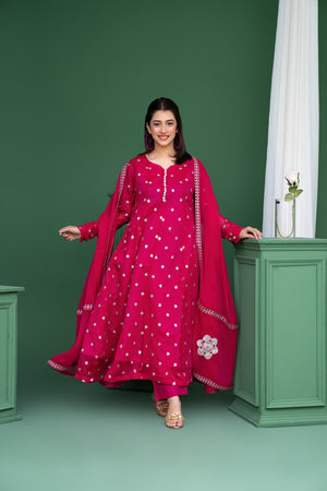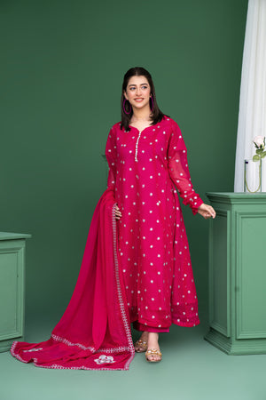 Turn heads with this vibrant shocking pink 3-piece set, designed to bring bold elegance and festive charm to your special occasions. Crafted in flowy chiffon with intricate silver embroidery and dainty button detailing, this statement silhouette is perfect for weddings, mehndi nights, and grand celebrations.
