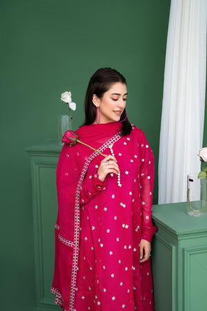 2178 - Shocking Pink 3 Piece Embroidered Chiffon Suit