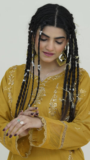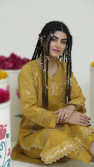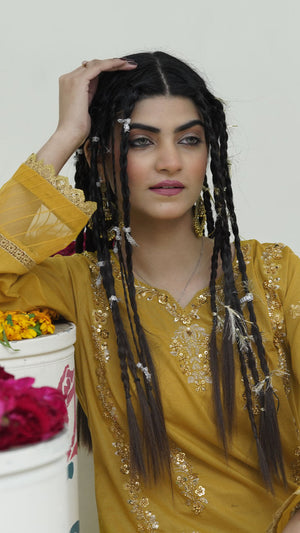 ✨ Step into timeless elegance with this Mustard Gold embroidered suit, crafted for a graceful and chic look. The intricately embroidered front shirt highlights delicate artistry, while the embroidered sleeves bring a touch of charm. A dyed back ensures smooth continuity, paired with dyed trousers for all-day comfort. The addition of embroidered lace details elevates the sophistication, making it a perfect choice for casual and semi-formal gatherings.