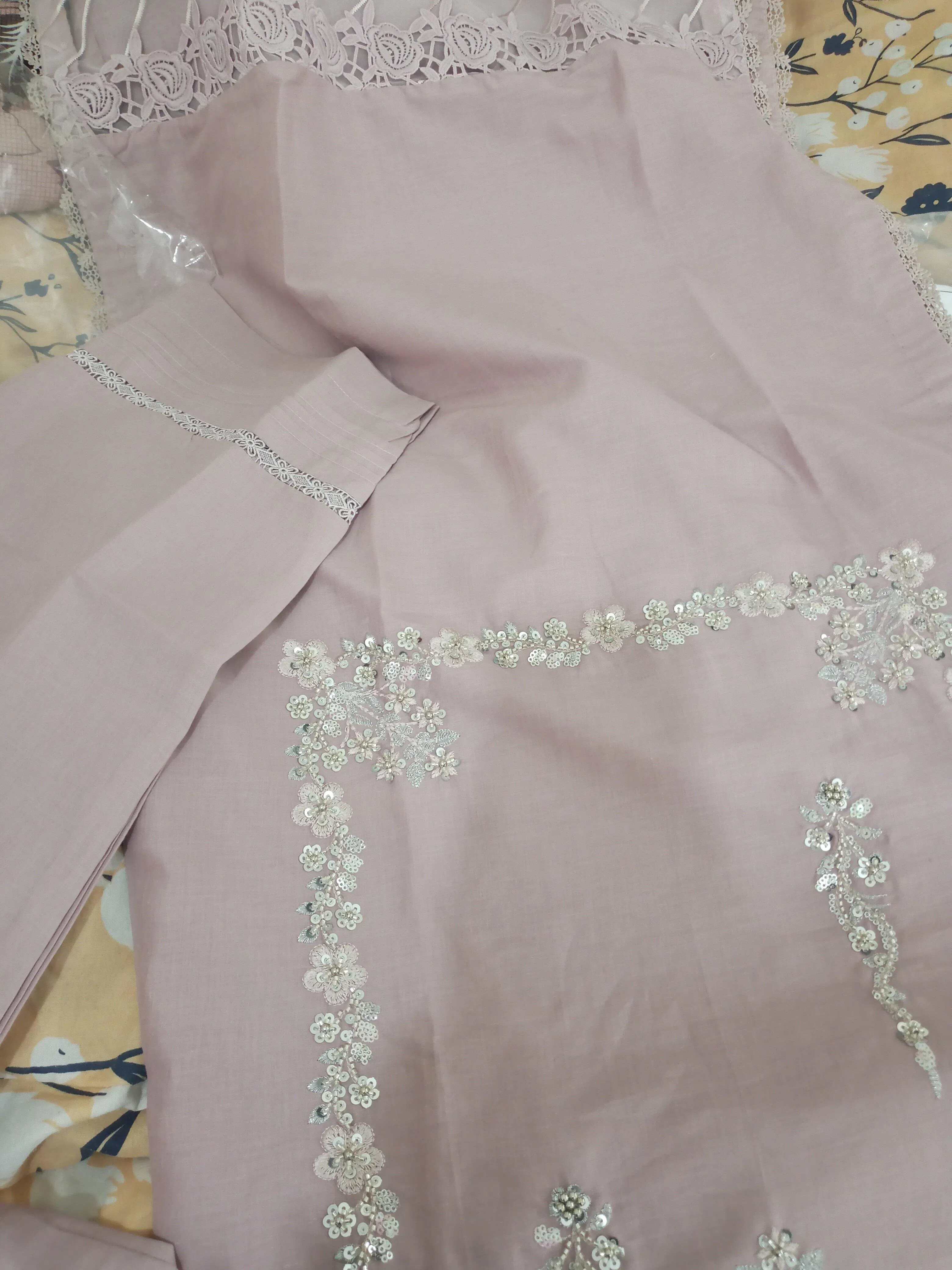 Elevate your style with this Light Pink embroidered suit, a perfect blend of tradition and elegance. The front features exquisite embroidery with golden threadwork, creating a regal charm, while the embroidered sleeves add a graceful touch. A dyed back ensures continuity, paired with dyed trousers for a chic finish. The hemline is enhanced with embroidered lace detailing, making this outfit ideal for both casual and semi-formal occasions.
