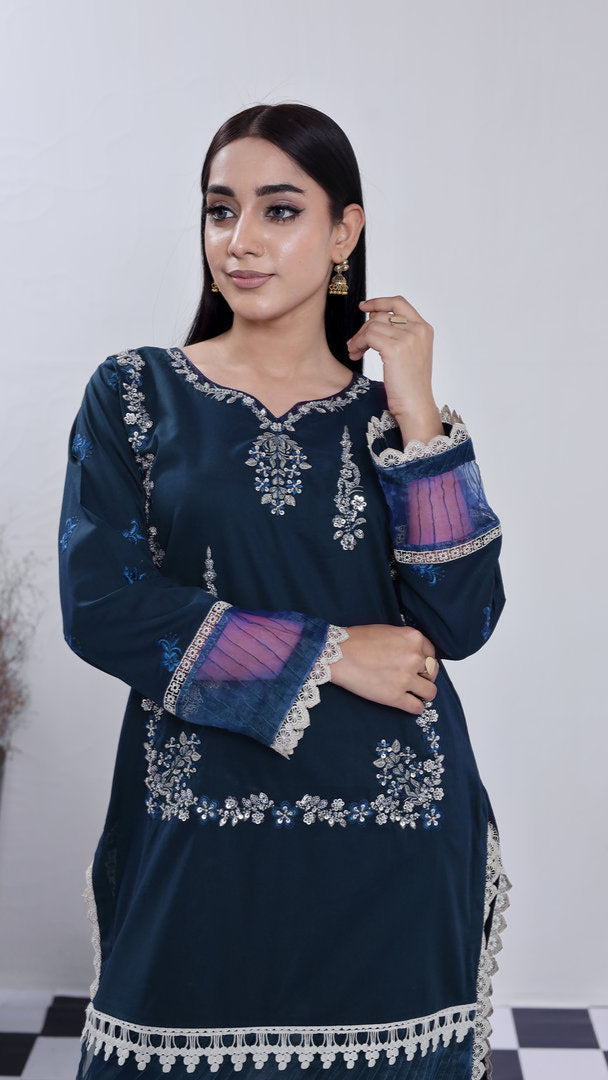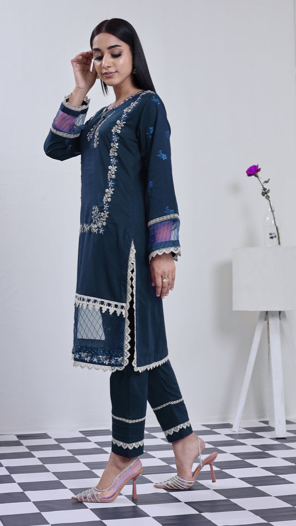 Elevate your style with this Zinc Blue embroidered suit, a perfect blend of tradition and elegance. The front features exquisite embroidery with golden threadwork, creating a regal charm, while the embroidered sleeves add a graceful touch. A dyed back ensures continuity, paired with dyed trousers for a chic finish. The hemline is enhanced with embroidered lace detailing, making this outfit ideal for both casual and semi-formal occasions.