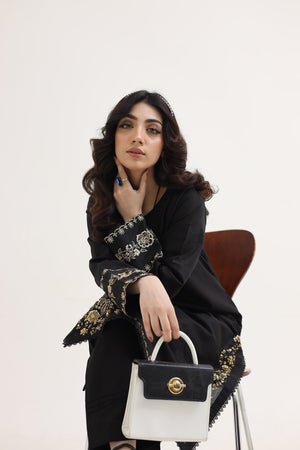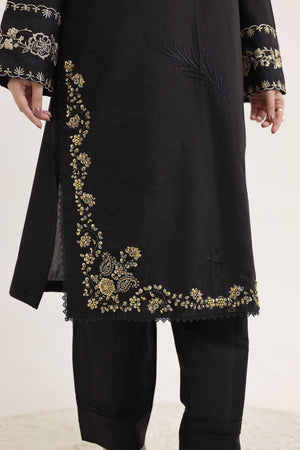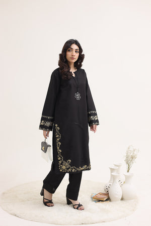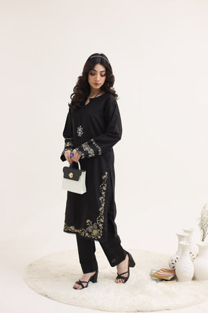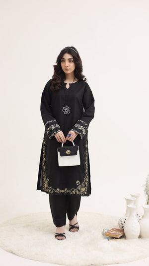 Step into timeless elegance with this classic black 2-piece embroidered suit. Crafted from premium-quality fabric, the outfit features intricate golden floral embroidery along the sleeves and hemline, adding a refined touch to its minimalist design. The shirt comes with a subtle keyhole neckline and side slits for easy movement, paired with tailored black trousers for a sleek silhouette.