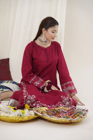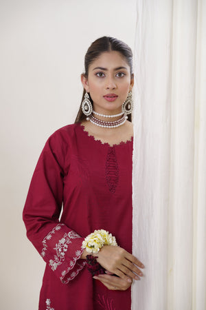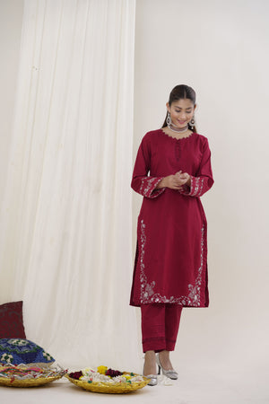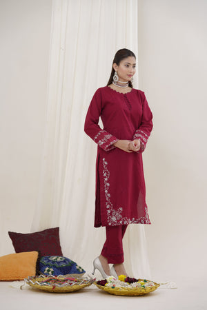 Step into regal elegance with this luxurious maroon 2-piece embroidered suit. Crafted from premium-quality fabric, the outfit features intricate golden floral embroidery along the sleeves and hemline, adding a touch of grandeur to its rich tone. The shirt boasts a subtle keyhole neckline and side slits for easy movement, paired with tailored maroon trousers for a sleek, coordinated silhouette.