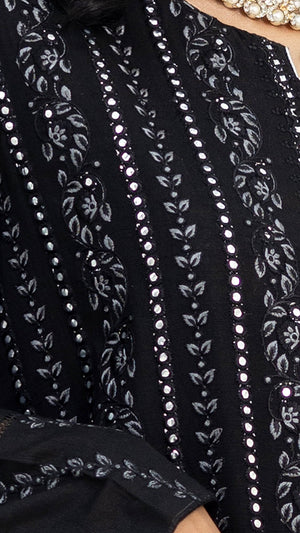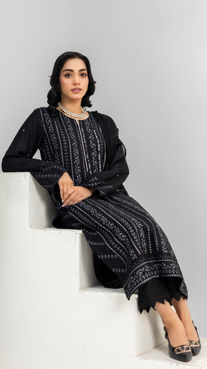 Upgrade your wardrobe with this sophisticated black embroidered 3-piece Cotton lawn suit, designed for both grace and comfort. The delicate embroidery and intricate lace detailing on the daman and sleeves add a touch of timeless elegance, making it a must-have for the season.