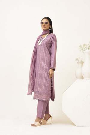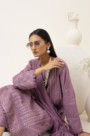 Upgrade your summer wardrobe with this elegant lilac embroidered 3-piece Cotton lawn suit, designed for both beauty and comfort. Featuring delicate embroidery with stunning floral patterns, this outfit adds a touch of charm to any occasion.