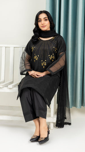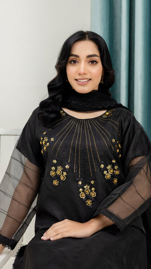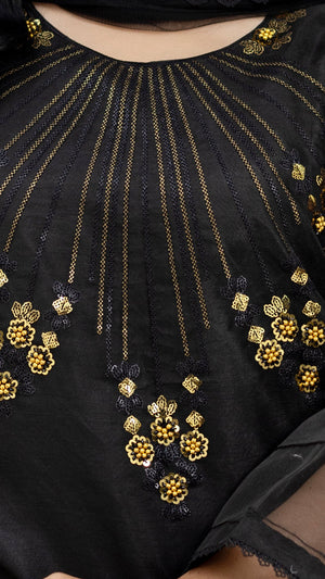 Step into effortless elegance with this stunning black 4-piece kurta set, perfect for festive evenings and special celebrations. The straight organza kurta features intricate embellishments in gold and silver tones ✨, adding just the right amount of shine. Paired with sleek kattan silk straight trousers, a soft net dupatta, and a comfortable slip, this ensemble balances style and sophistication beautifully.