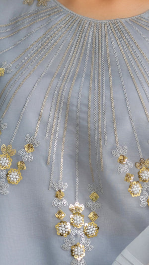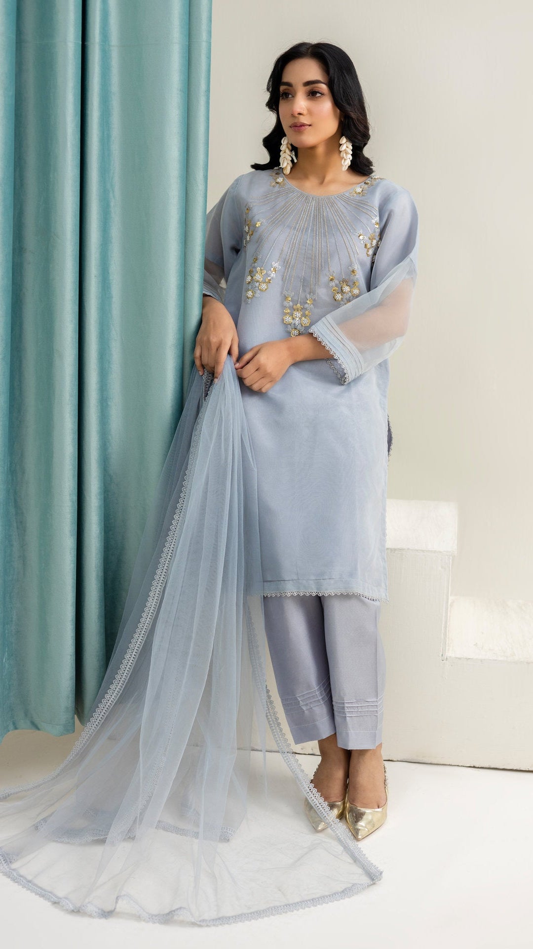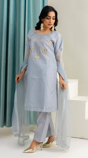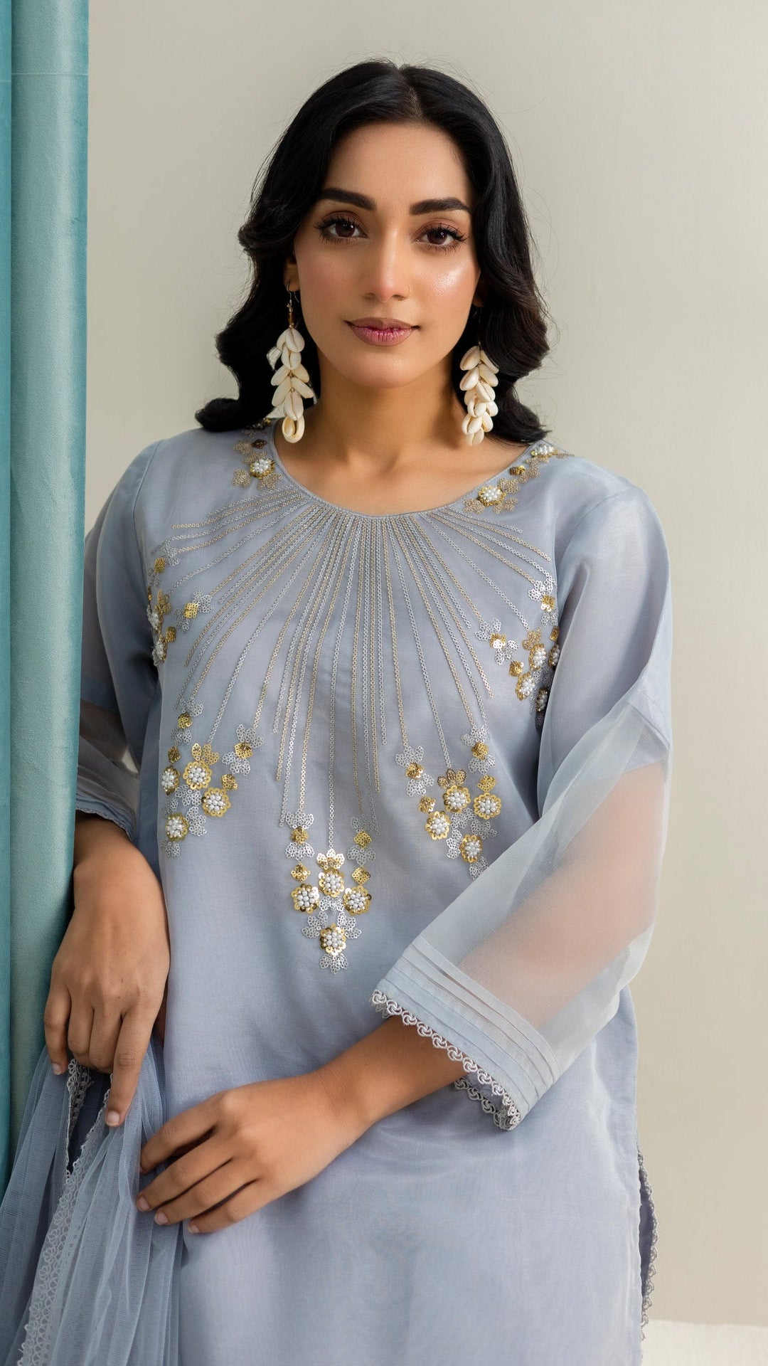 Step into elegance with this grey embellished kurta set, designed for the modern woman who loves timeless style. The straight-cut organza kurta features intricate embellishments that add a festive sparkle, while the kattan silk straight trousers bring a refined finish. ๐ซ๏ธ๐