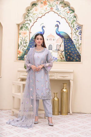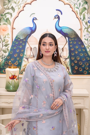 Elevate your festive wardrobe with this graceful 4-piece grey kurta set, designed for elegance and versatility. The straight-cut organza kurta features intricate embellished work, adding a touch of sparkle to its soft, flowing silhouette. It’s paired with kattan silk straight trousers for a polished finish. A lightweight net dupatta and matching slip ensure a complete, refined look—perfect for weddings, parties, and festive gatherings.