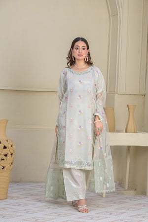 Delicate, dreamy, and effortlessly elegant—this 4-piece pista green kurta set is perfect for those who love understated glamour. The organza straight kurta is beautifully adorned with pastel-hued embellishments and sequin detailing along the hem, paired with kattan silk straight trousers for a sleek, polished look. The net dupatta, finished with embroidered accents and scalloped edges, adds a touch of sophistication, while the included slip ensures comfort and coverage.