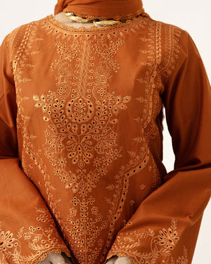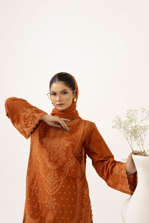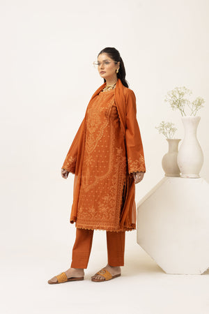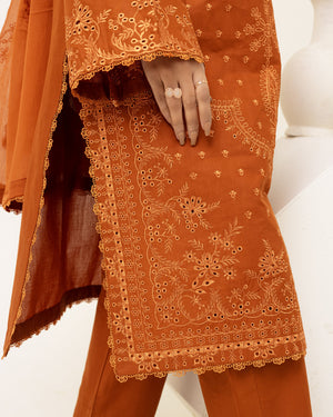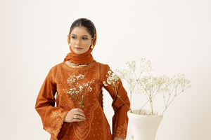 Infuse your summer wardrobe with the vibrant charm of this orange embroidered 3-piece Cotton lawn suit, designed for both style and comfort. The bright orange hue paired with delicate embroidery gives this outfit a lively and sophisticated touch.