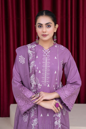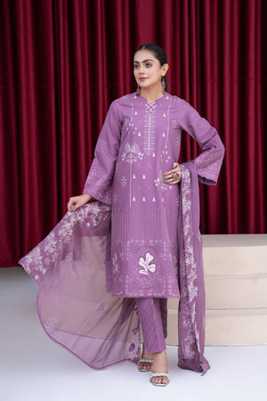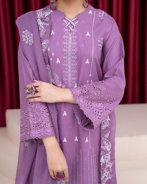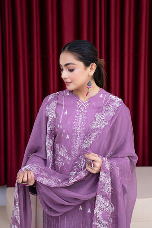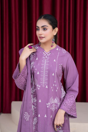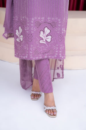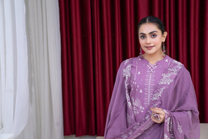 Elevate your wardrobe with timeless elegance in our piyazi 3-piece embroidered lawn suit. This stunning ensemble features a soft mauve hue adorned with intricate white thread embroidery, showcasing delicate floral patterns and detailed cutwork on the sleeves and hem.