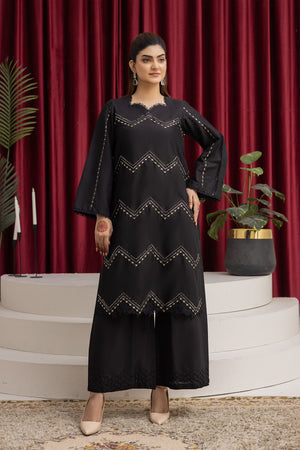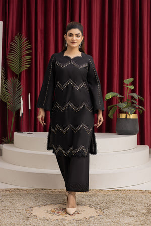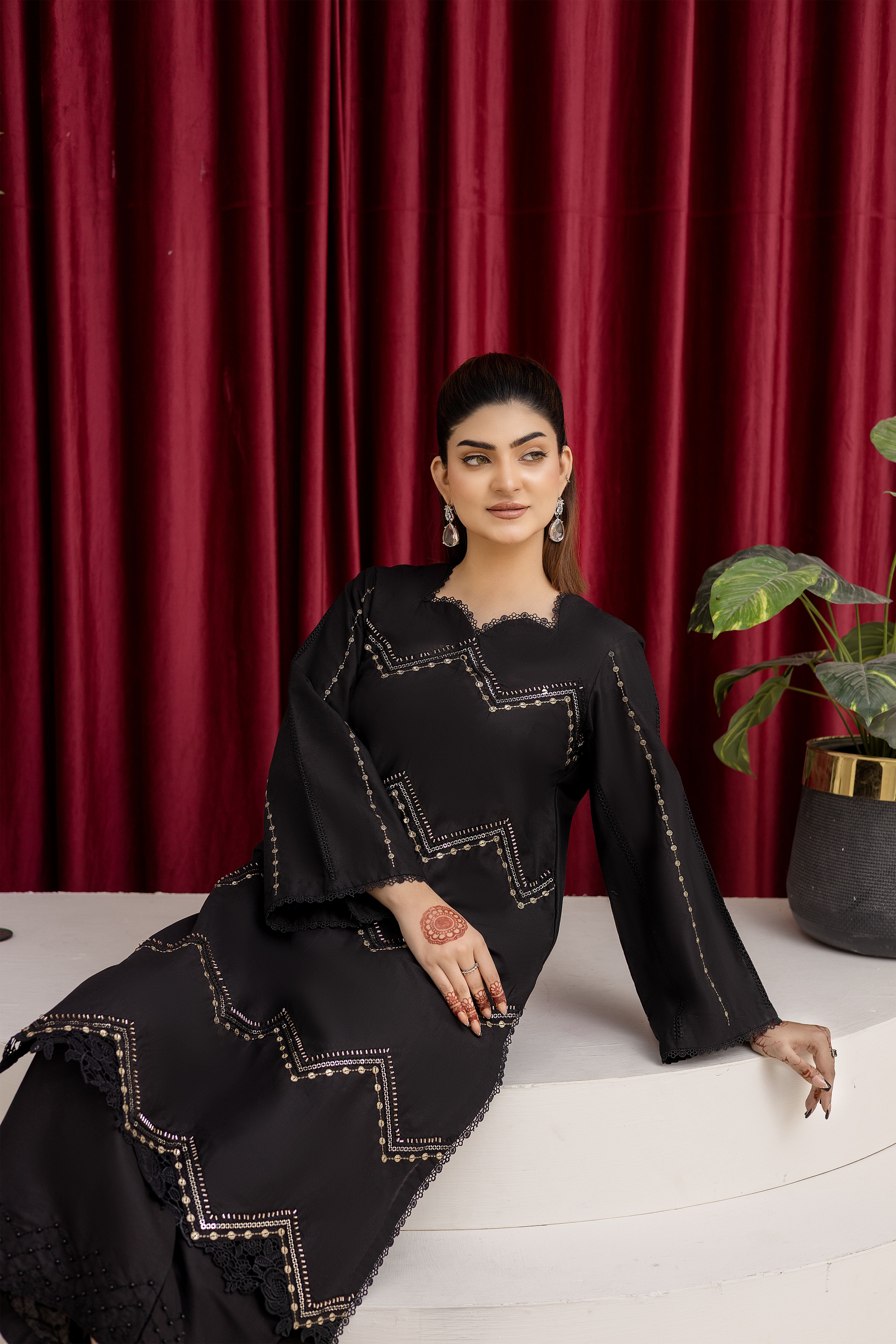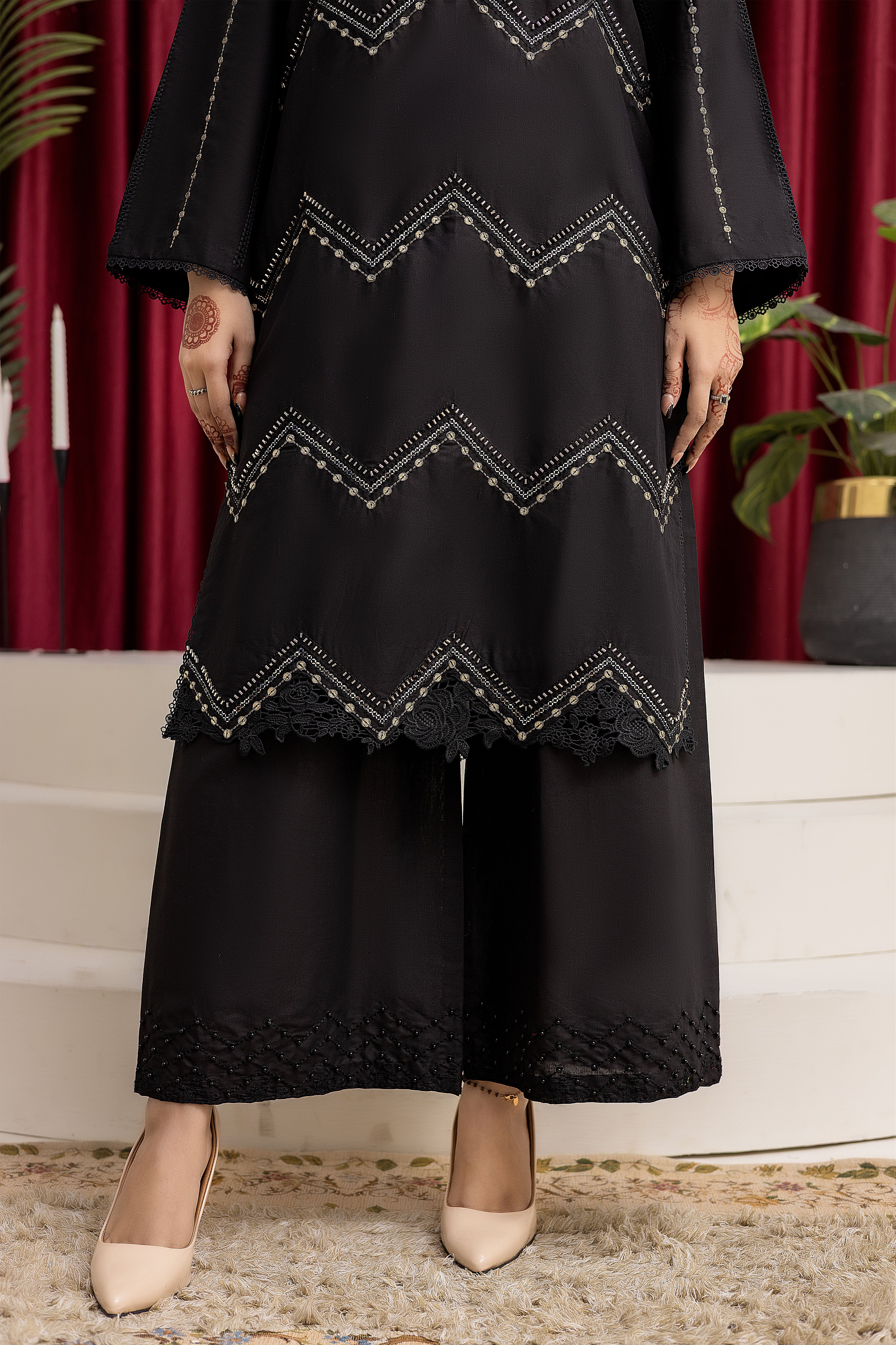 This sophisticated black 2-piece outfit is designed to bring a perfect blend of elegance and style to your wardrobe. The straight kurta features a unique chevron-style embroidered pattern in gold and silver tones, adding a refined charm. The wide-leg trousers are finished with delicate lace details at the hem, completing the graceful look.