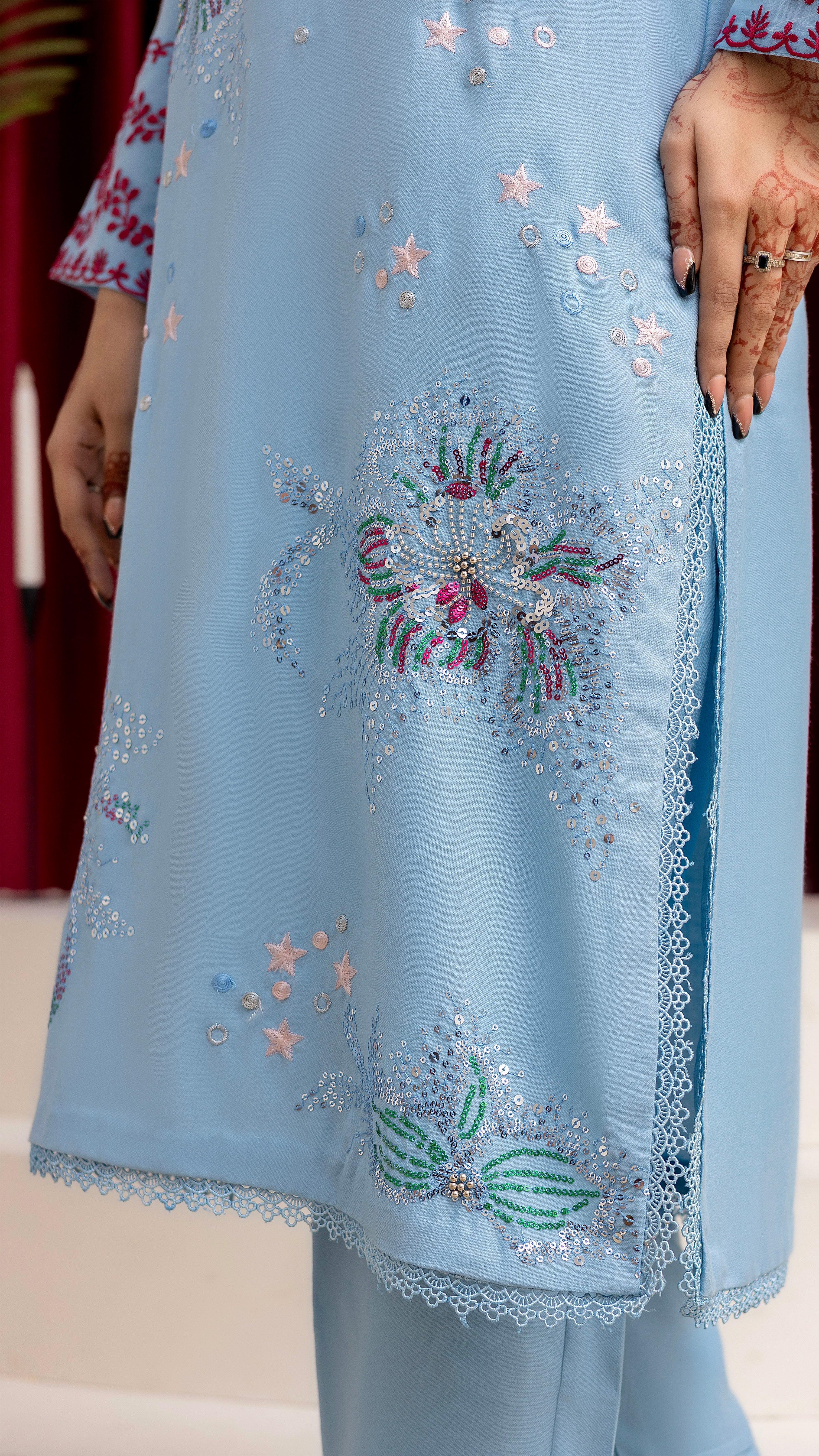 Turn heads with this striking Sky Blue Dhanak 2-piece ensemble, designed to bring elegance and charm to your festive wardrobe. The straight-cut shirt is beautifully adorned with intricate mirror and sequin embellishments, forming floral and star patterns that sparkle with every movement. The delicately embroidered sleeves, finished with lace and tassel detailing, add a graceful touch to the overall look.