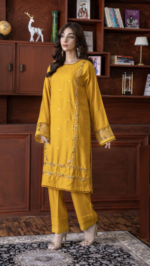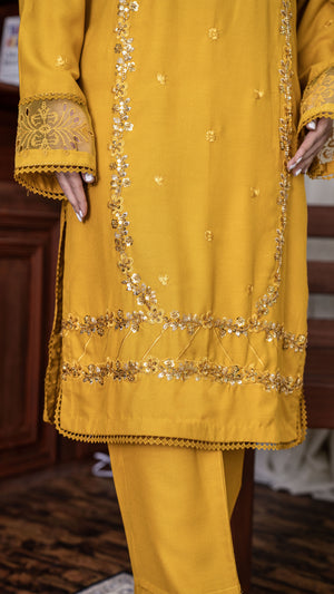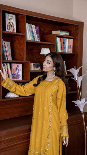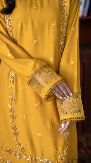 Step into timeless elegance with this 2-Piece Golden Embroidered Suit. Crafted from premium fabric, the long shirt is beautifully detailed with delicate thread embroidery and intricate cutwork on the hem and sleeves. The matching wide-leg trousers feature a scalloped border, adding a graceful touch to the outfit.