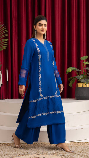 This elegant 2-piece ensemble is crafted in a rich ink Blue adorned with golden floral embroidery that adds a touch of luxury. The shirt features a scalloped neckline and intricate embellishments, paired with straight trousers that have lace accents for a refined finish. Completing the look, making it a perfect outfit for festive gatherings, weddings, or special occasions.