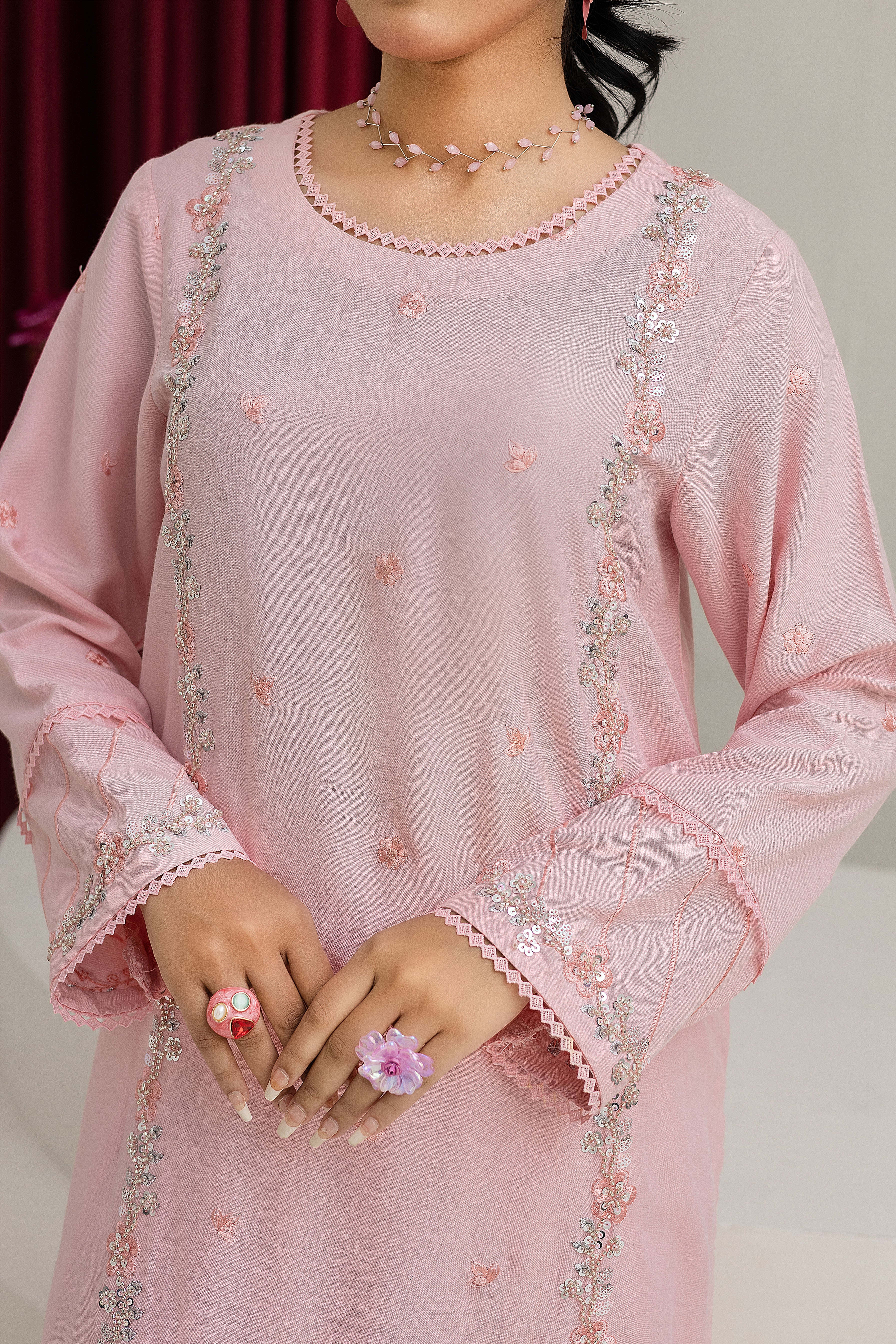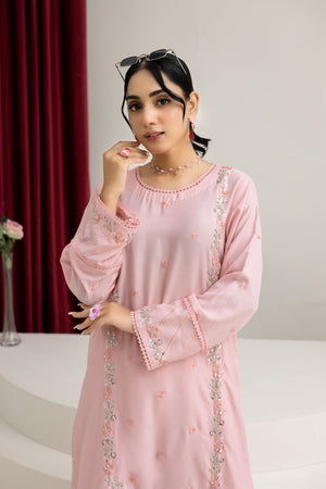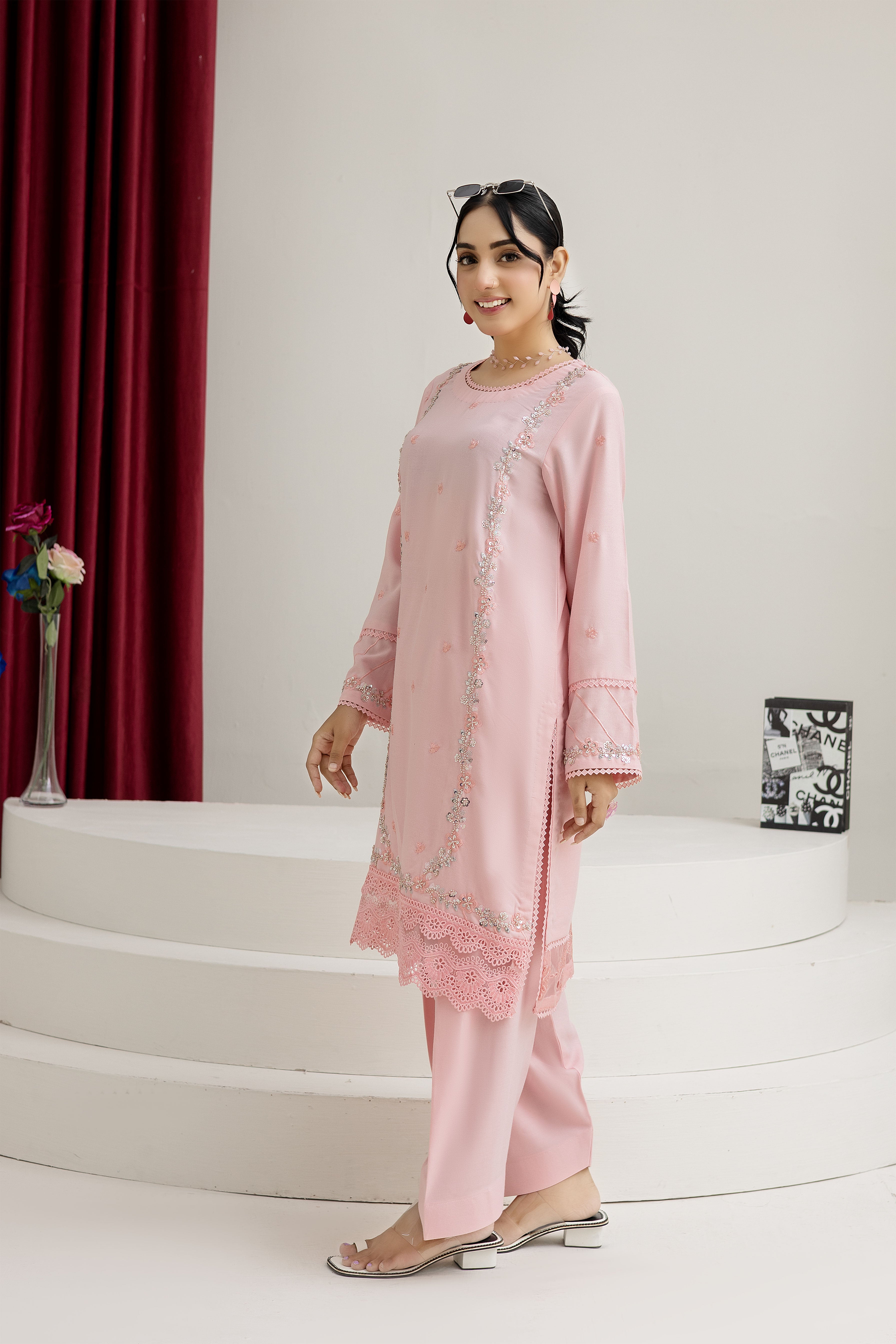 Add a touch of soft elegance to your wardrobe with this light pink 2-piece suit. The kurta is beautifully designed with delicate embroidery on the front, sleeves, and hemline, enhanced with intricate lace detailing. The straight trousers complete the look, making it perfect for casual gatherings and semi-formal events.