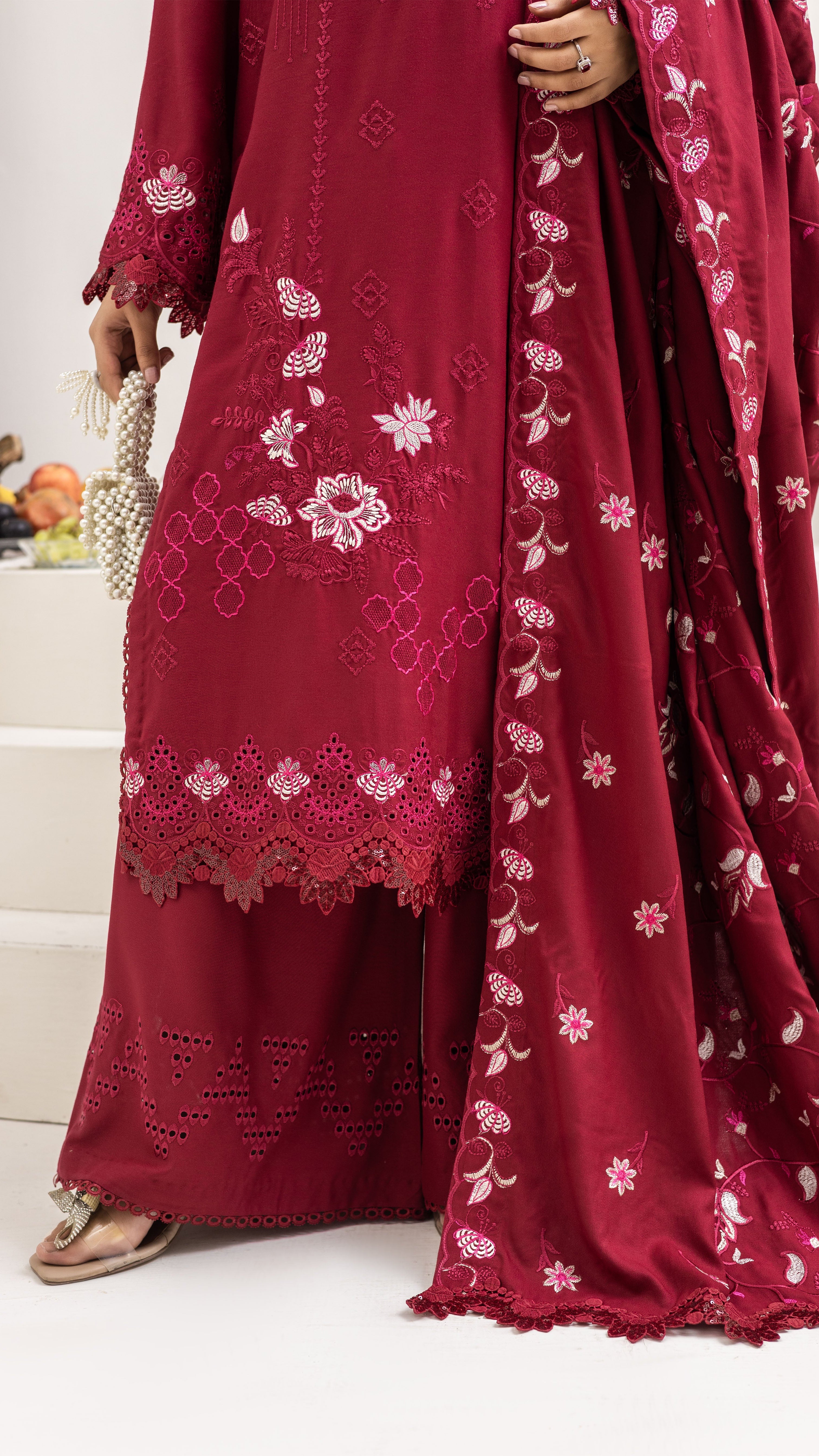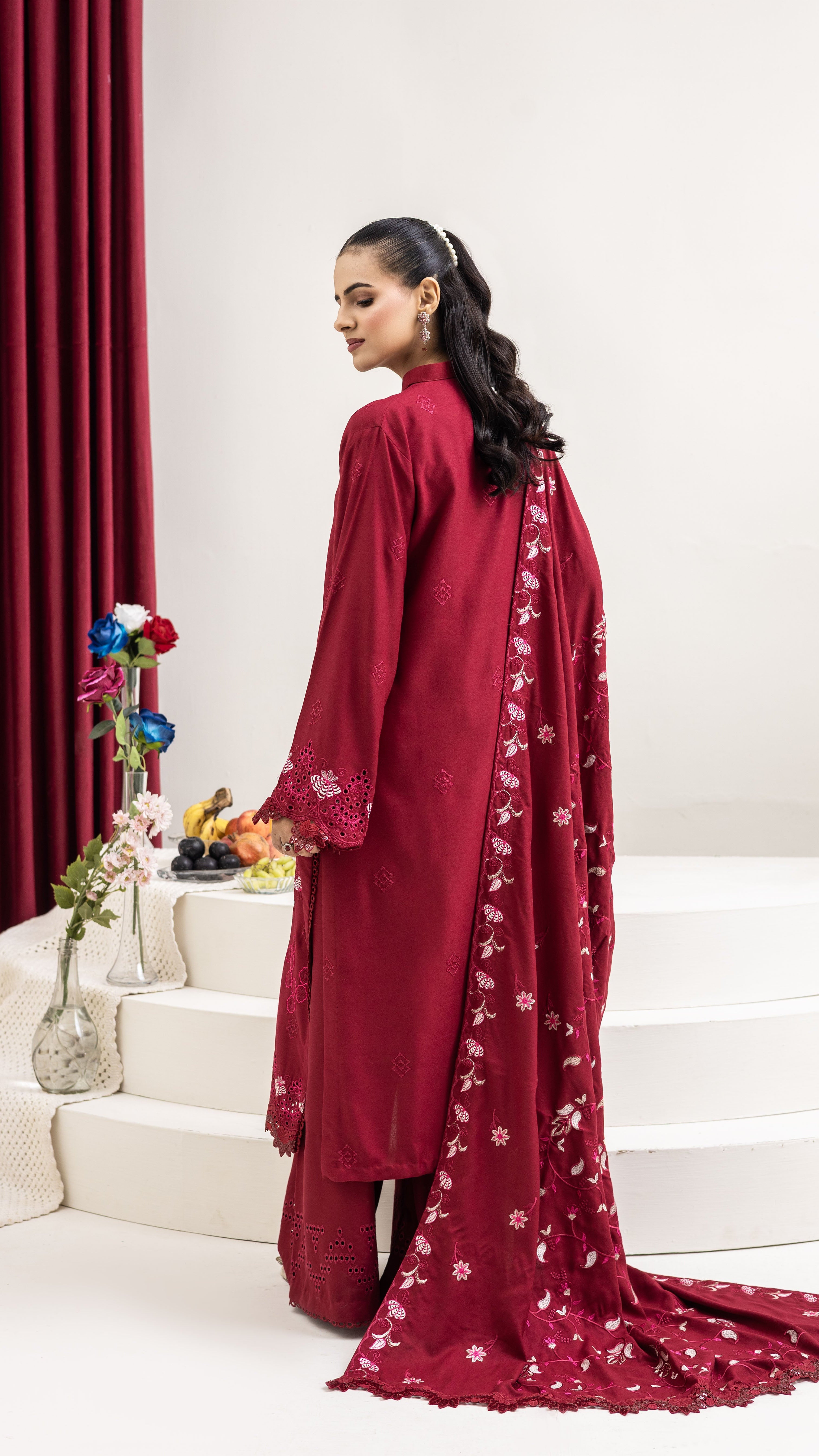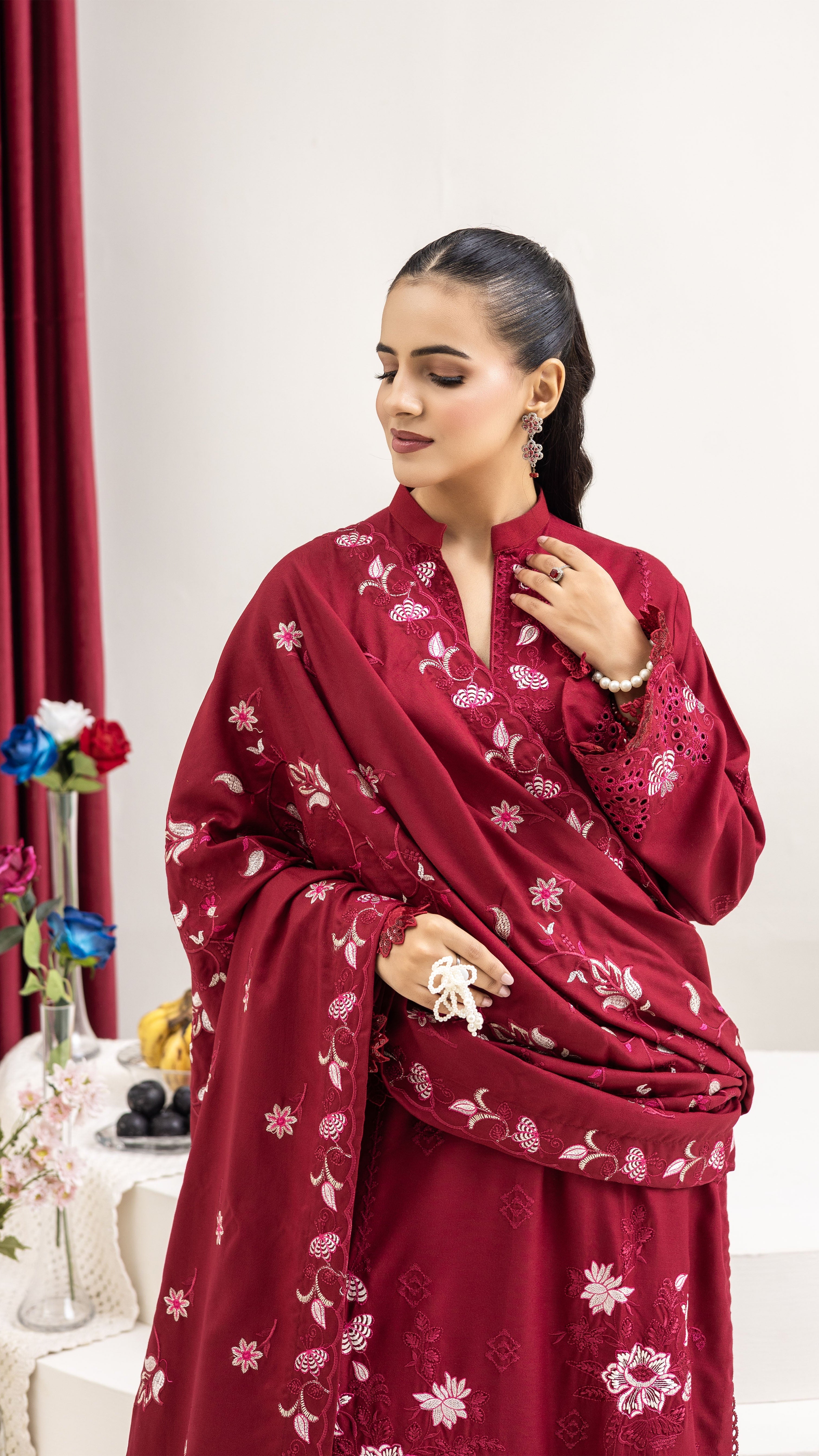 Elevate your festive style with this stunning 3-piece embroidered set in a soft Hot Pink shade. The shirt features all-over floral embroidery with intricate cutwork borders, paired with stylish trousers showcasing matching embroidery and cutwork details. The beautifully embroidered dupatta completes the look with a graceful drape, making it a perfect choice for weddings, parties, and elegant gatherings.