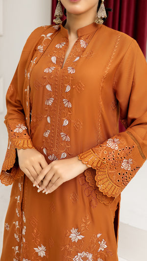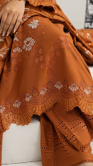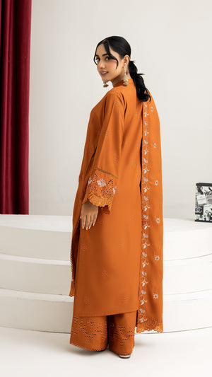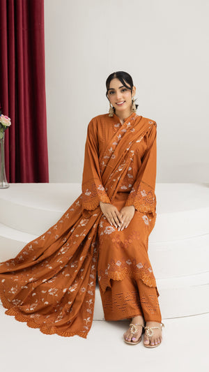 Elevate your festive style with this stunning 3-piece embroidered set in a soft Orange shade. The shirt features all-over floral embroidery with intricate cutwork borders, paired with stylish trousers showcasing matching embroidery and cutwork details. The beautifully embroidered dupatta completes the look with a graceful drape, making it a perfect choice for weddings, parties, and elegant gatherings.