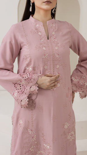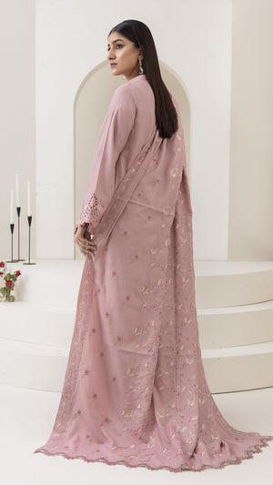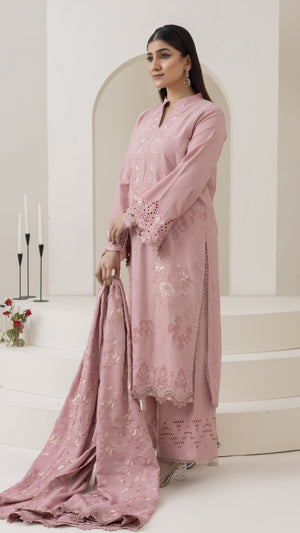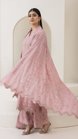Elevate your festive style with this stunning 3-piece embroidered set in a soft piyazi pink shade. The shirt features all-over floral embroidery with intricate cutwork borders, paired with stylish trousers showcasing matching embroidery and cutwork details. The beautifully embroidered dupatta completes the look with a graceful drape, making it a perfect choice for weddings, parties, and elegant gatherings.