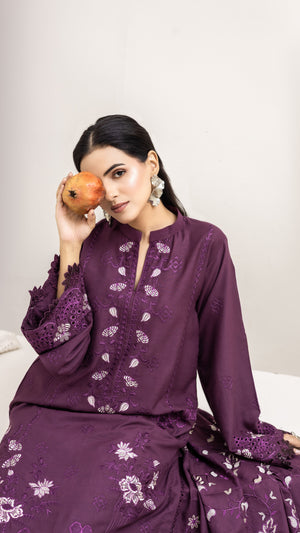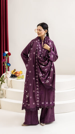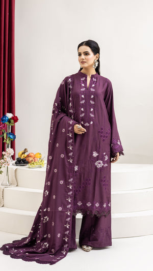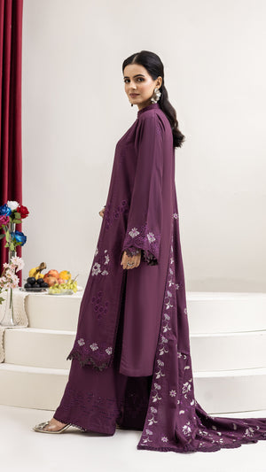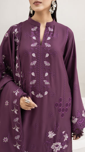 Elevate your festive style with this stunning 3-piece embroidered set in a soft Purple shade. The shirt features all-over floral embroidery with intricate cutwork borders, paired with stylish trousers showcasing matching embroidery and cutwork details. The beautifully embroidered dupatta completes the look with a graceful drape, making it a perfect choice for weddings, parties, and elegant gatherings.