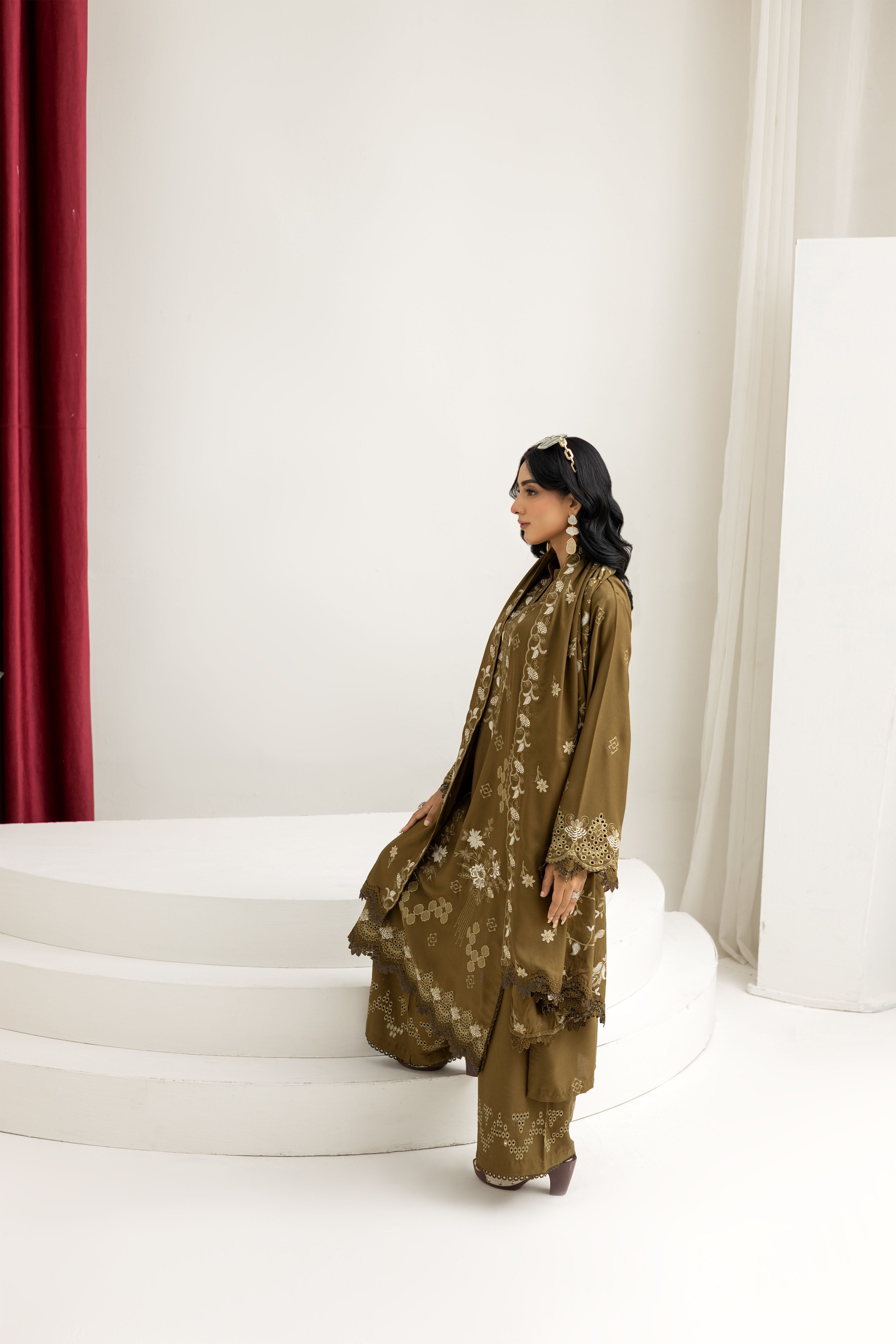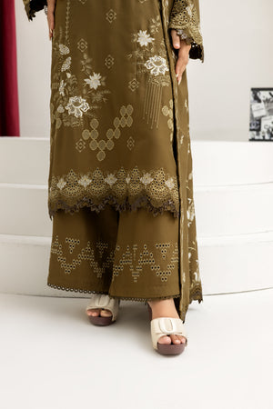 Elevate your festive style with this stunning 3-piece embroidered set in a soft Tobacoo shade. The shirt features all-over floral embroidery with intricate cutwork borders, paired with stylish trousers showcasing matching embroidery and cutwork details. The beautifully embroidered dupatta completes the look with a graceful drape, making it a perfect choice for weddings, parties, and elegant gatherings.
