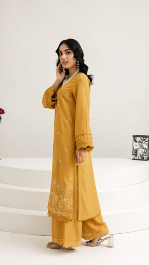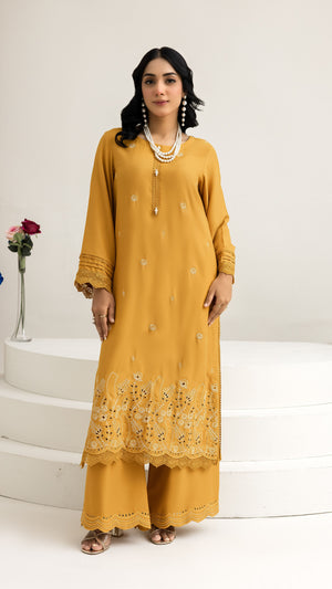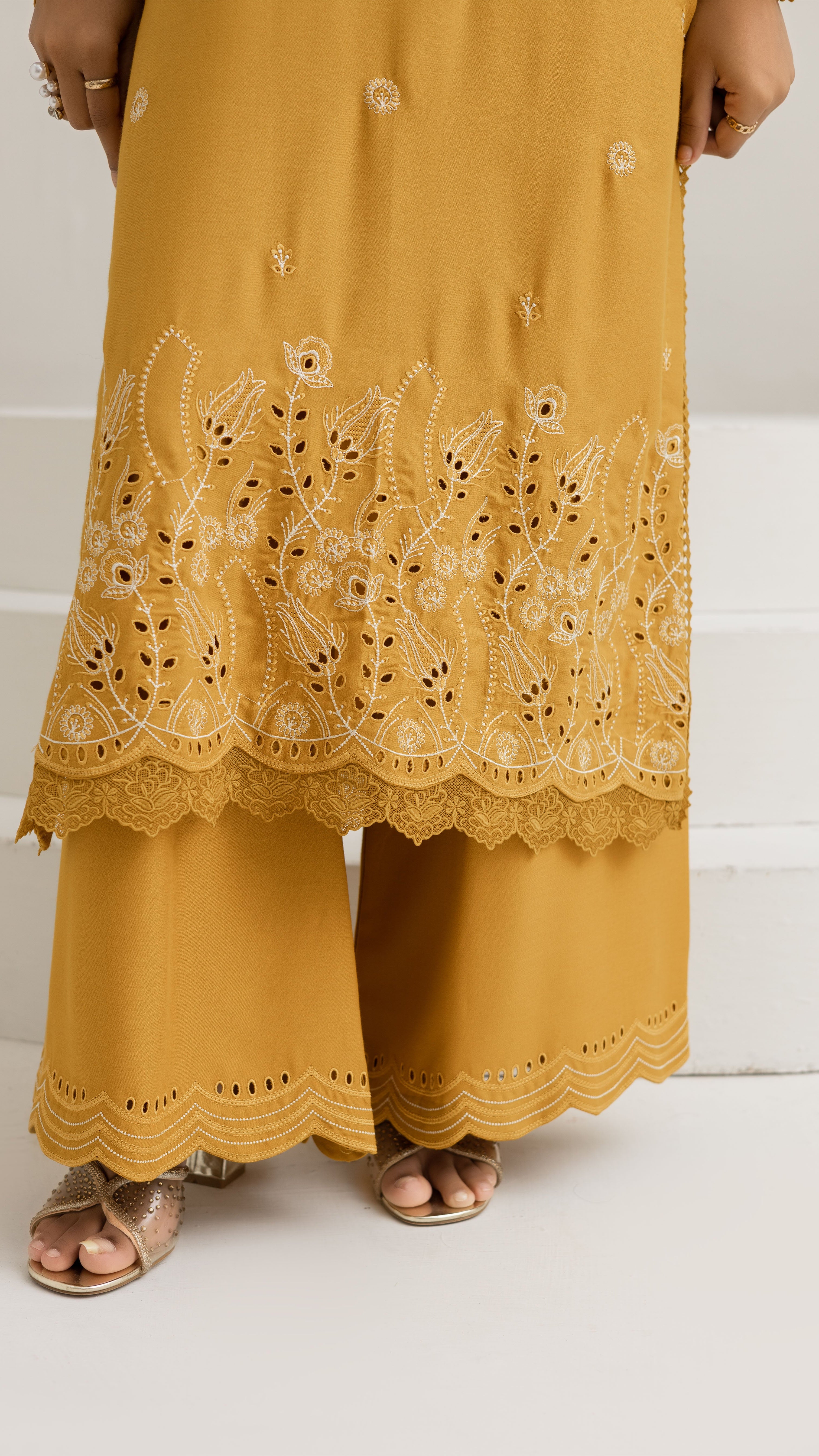 Step into timeless elegance with this 2-Piece Gold Embroidered Suit. Crafted from premium fabric, the long shirt is beautifully detailed with delicate thread embroidery and intricate cutwork on the hem and sleeves. The matching wide-leg trousers feature a scalloped border, adding a graceful touch to the outfit.