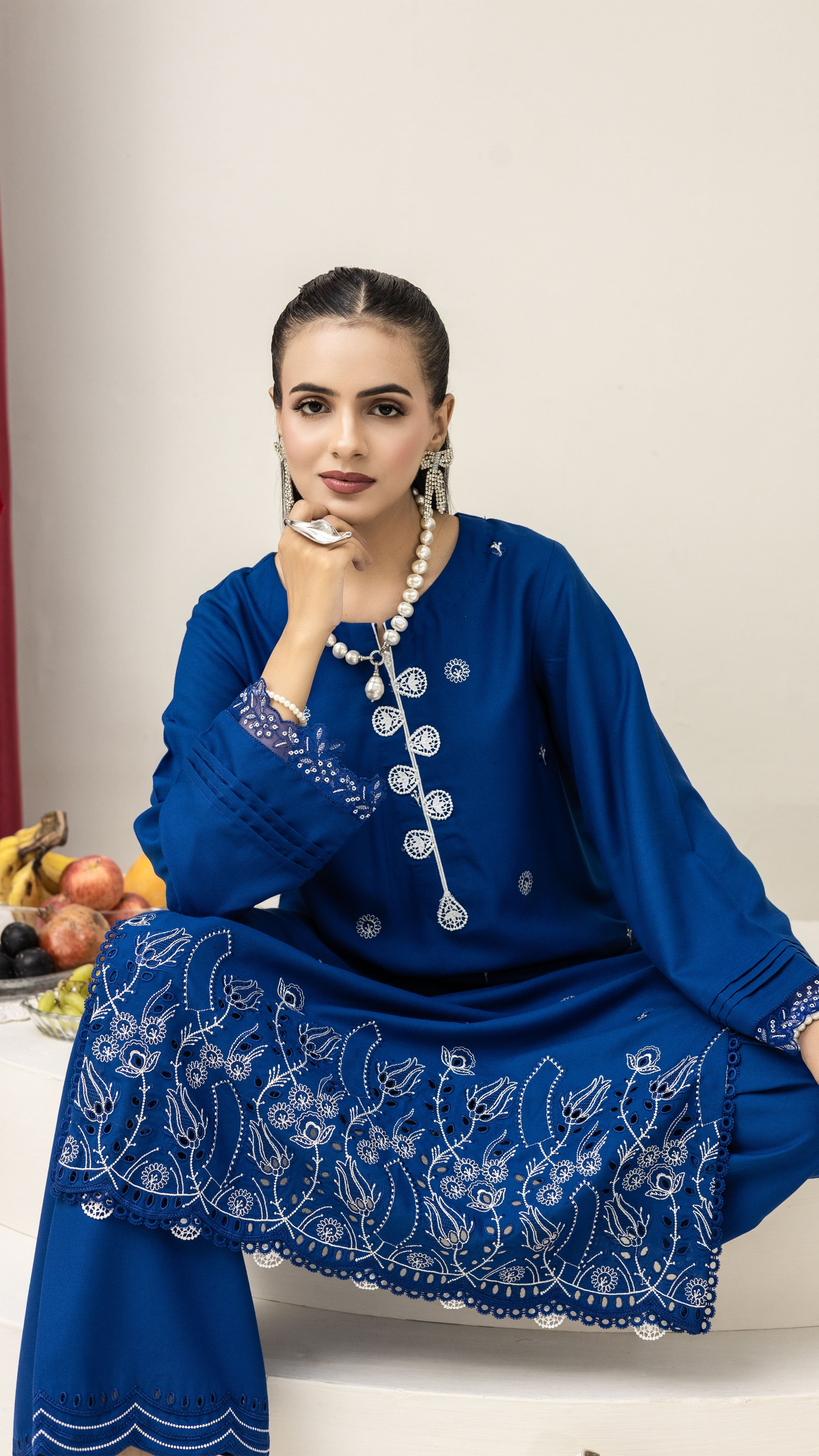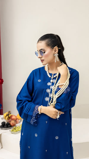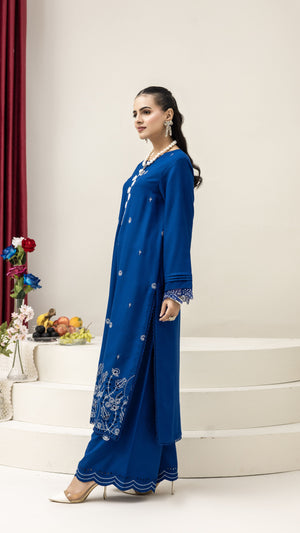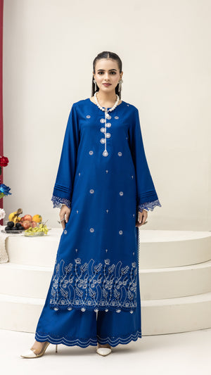 Step into timeless elegance with this 2-Piece Ink Blue Embroidered Suit. Crafted from premium fabric, the long shirt is beautifully detailed with delicate thread embroidery and intricate cutwork on the hem and sleeves. The matching wide-leg trousers feature a scalloped border, adding a graceful touch to the outfit.