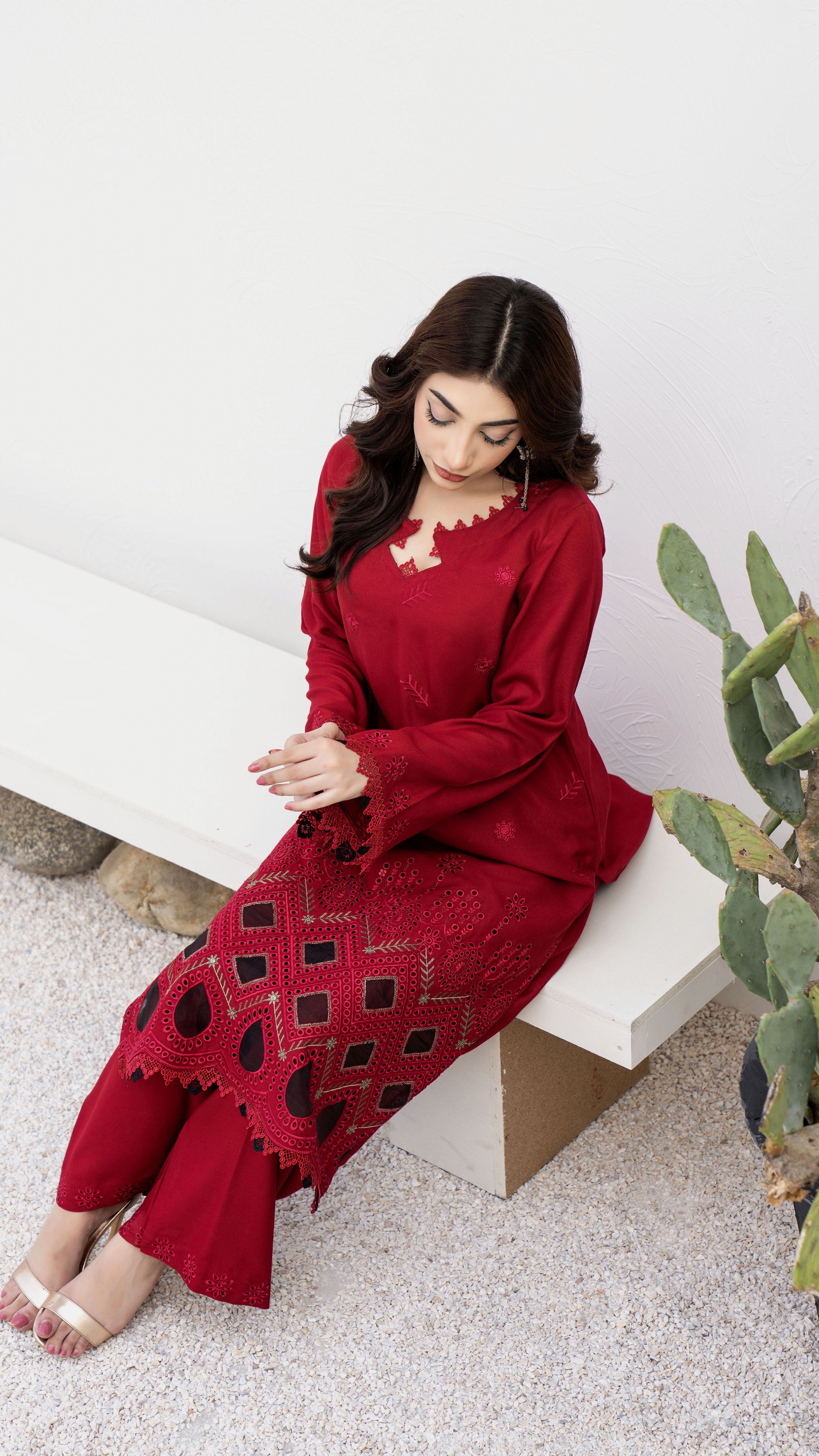 Add a touch of elegance to your wardrobe with this stunning deep red ensemble. The shirt features intricate thread embroidery and laser-cut detailing along the hem and sleeves, creating a refined and graceful look. The neckline design adds a stylish twist, making it perfect for both casual and semi-formal occasions. Paired with matching wide-leg trousers adorned with subtle embroidered accents for a cohesive finish.
