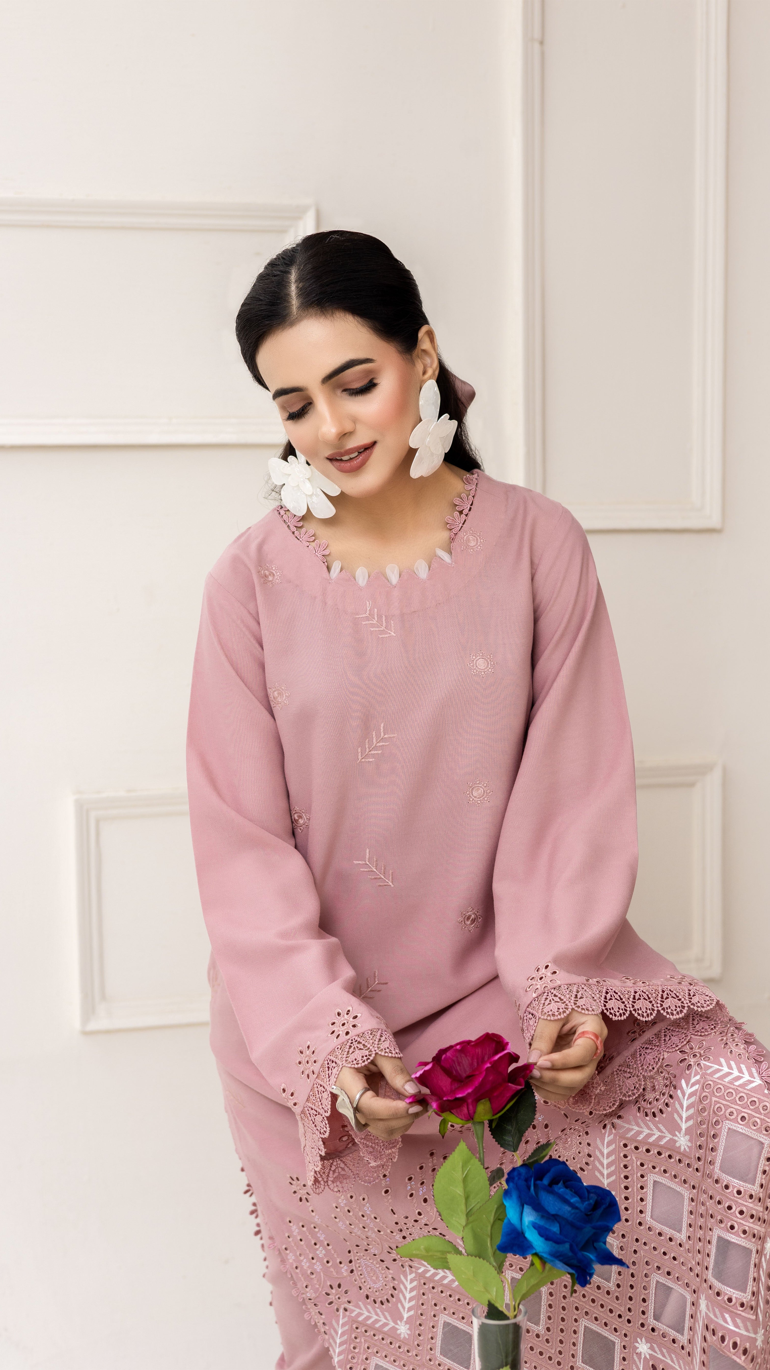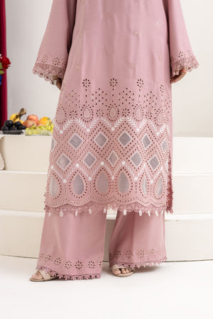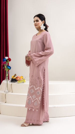 Add a touch of elegance to your wardrobe with this stunning light Pink ensemble. The shirt features intricate thread embroidery and laser-cut detailing along the hem and sleeves, creating a refined and graceful look. The neckline design adds a stylish twist, making it perfect for both casual and semi-formal occasions. Paired with matching wide-leg trousers adorned with subtle embroidered accents for a cohesive finish.