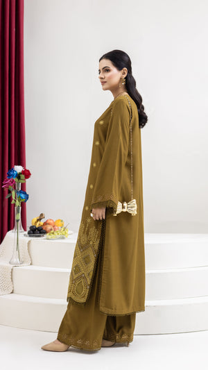 Add a touch of elegance to your wardrobe with this stunning deep Tobacoo ensemble. The shirt features intricate thread embroidery and laser-cut detailing along the hem and sleeves, creating a refined and graceful look. The neckline design adds a stylish twist, making it perfect for both casual and semi-formal occasions. Paired with matching wide-leg trousers adorned with subtle embroidered accents for a cohesive finish.
