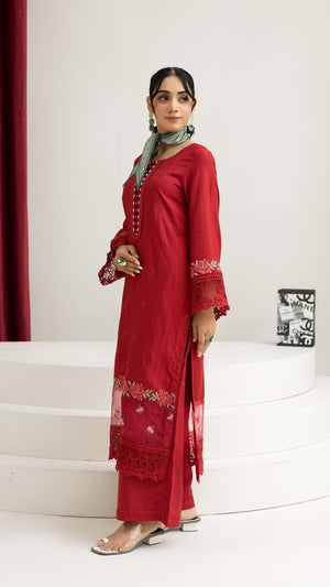 Make a bold statement with this 2-Piece Red Embroidered Viscose Suit. Designed with premium fabric, the long shirt is adorned with delicate thread embroidery and intricate lacework on the sleeves and hemline, creating a perfect blend of tradition and elegance. The embroidered detailing along the neckline adds charm, while the matching wide-leg trousers ensure a graceful finish.