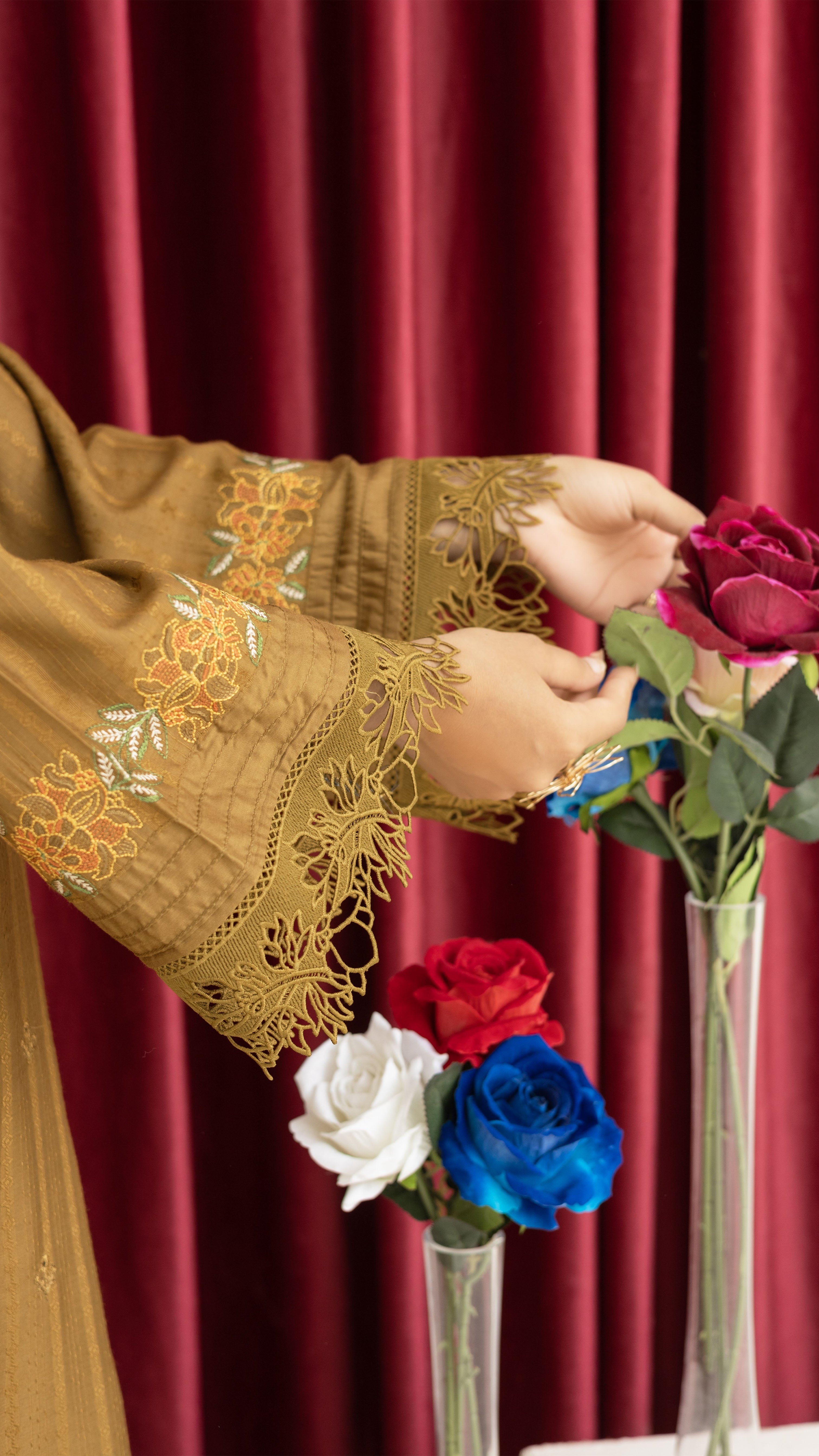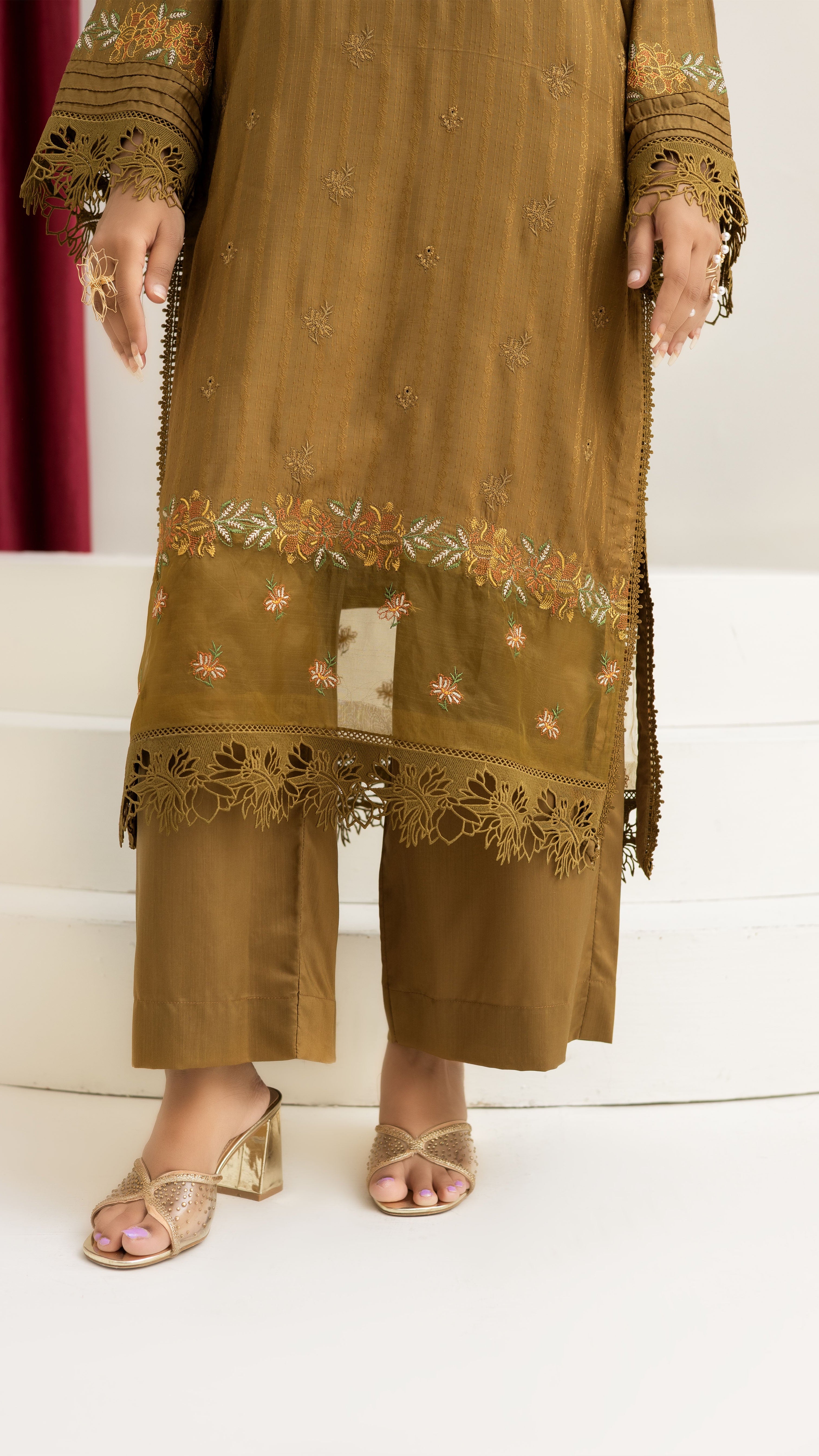Make a bold statement with this 2-Piece Tobacoo Embroidered Suit. Designed with premium fabric, the long shirt is adorned with delicate thread embroidery and intricate lacework on the sleeves and hemline, creating a perfect blend of tradition and elegance. The embroidered detailing along the neckline adds charm, while the matching wide-leg trousers ensure a graceful finish.