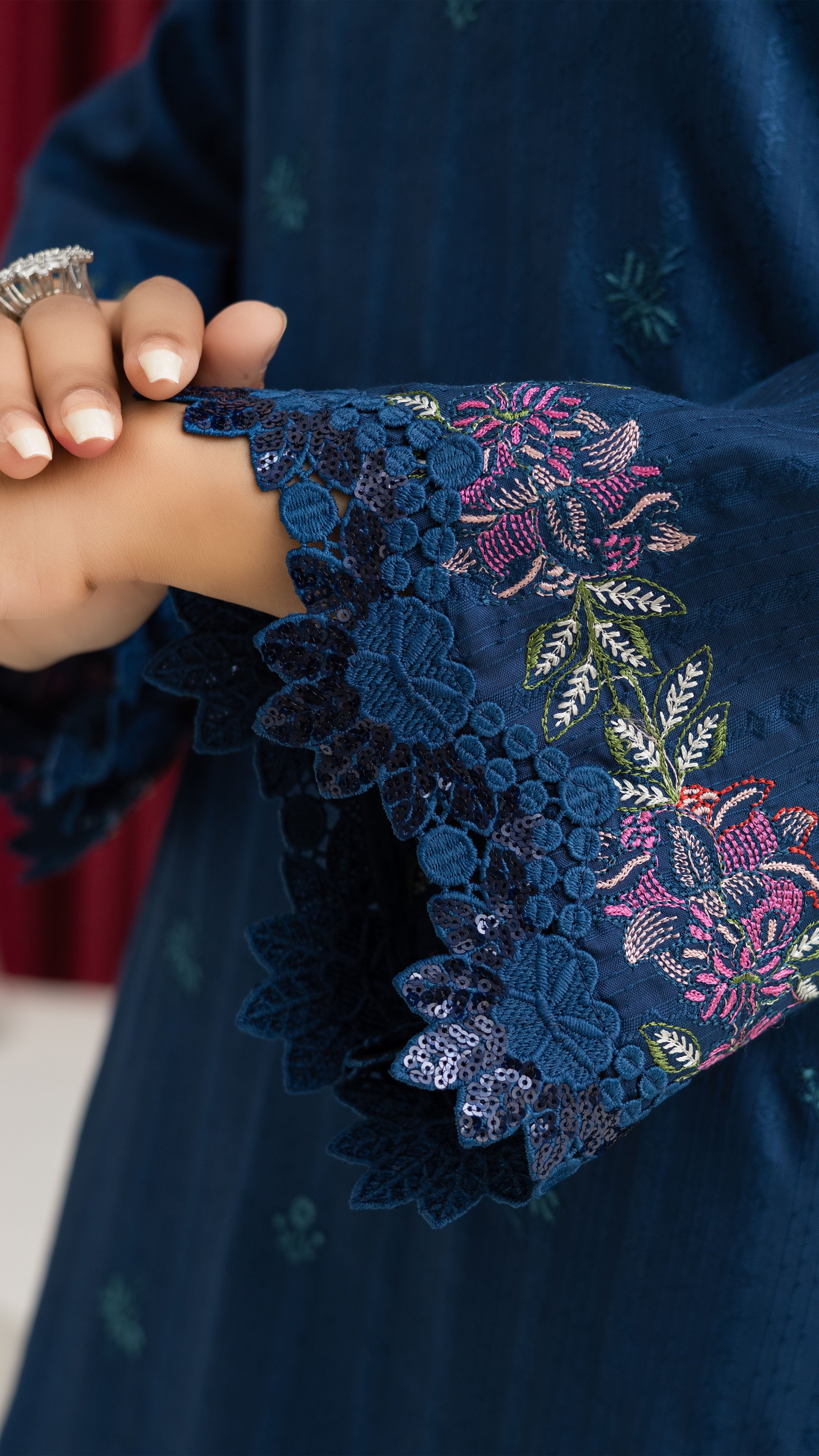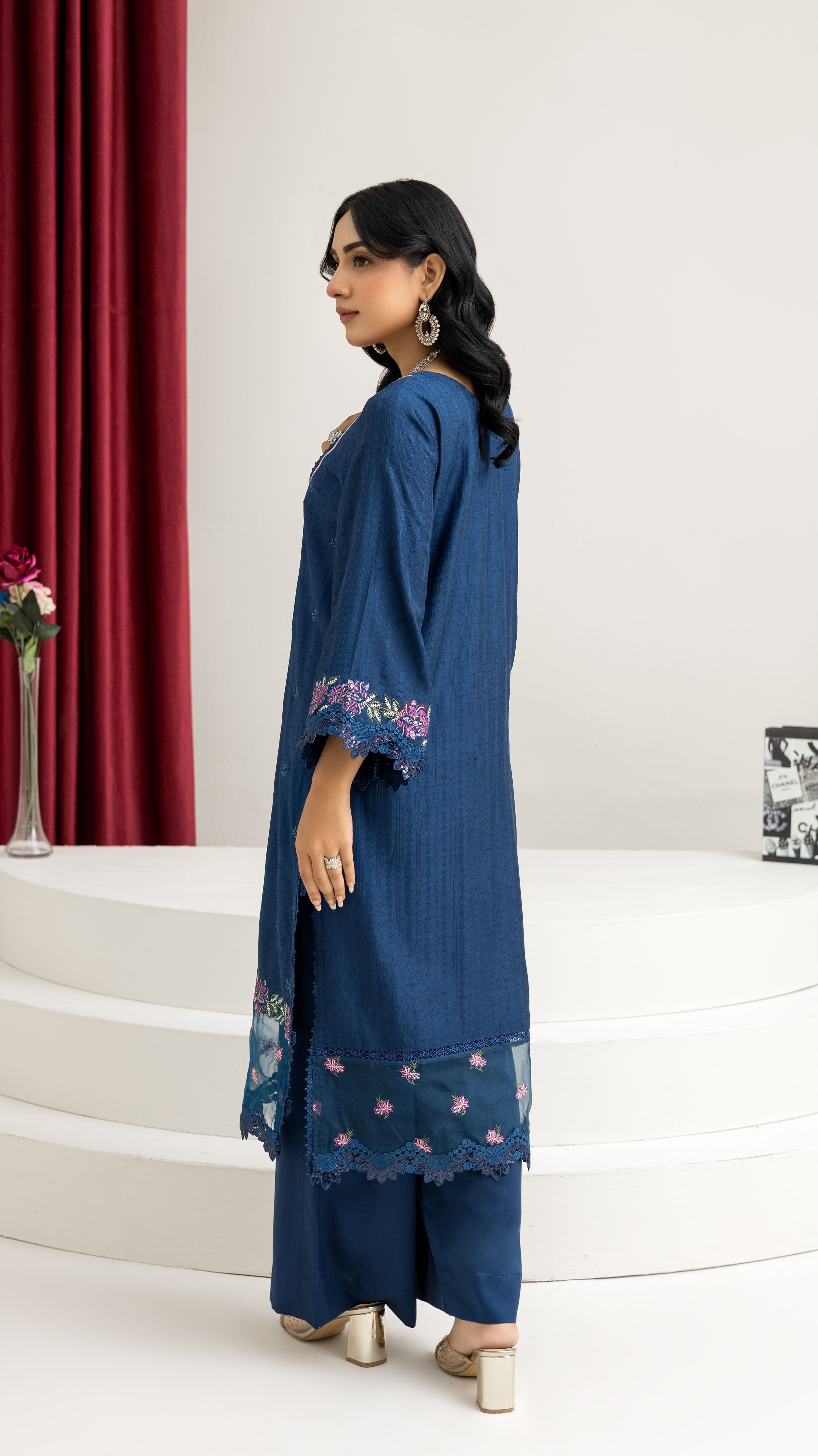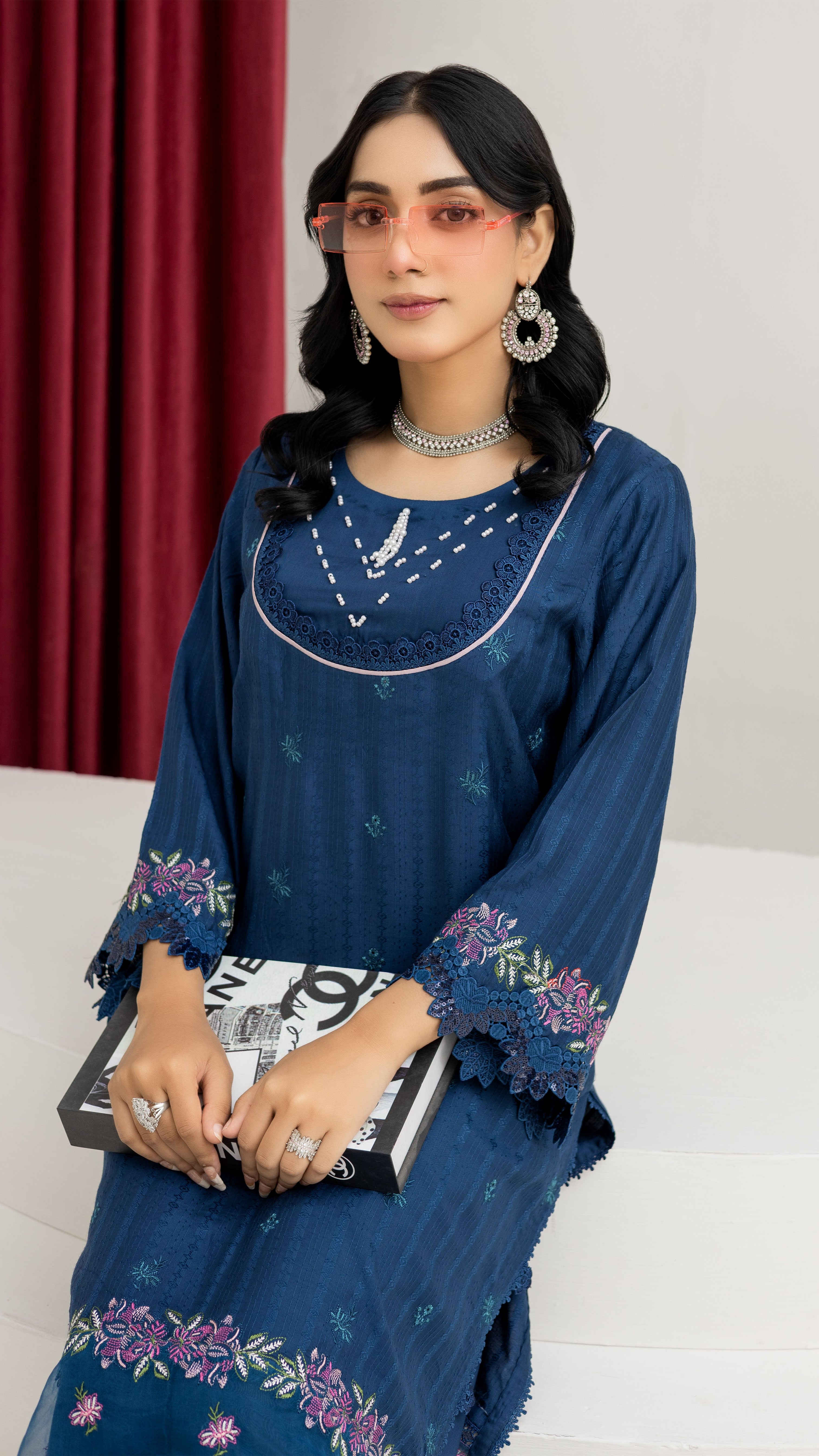 Make a bold statement with this 2-Piece Zinc Blue Embroidered Suit. Designed with premium fabric, the long shirt is adorned with delicate thread embroidery and intricate lacework on the sleeves and hemline, creating a perfect blend of tradition and elegance. The embroidered detailing along the neckline adds charm, while the matching wide-leg trousers ensure a graceful finish.