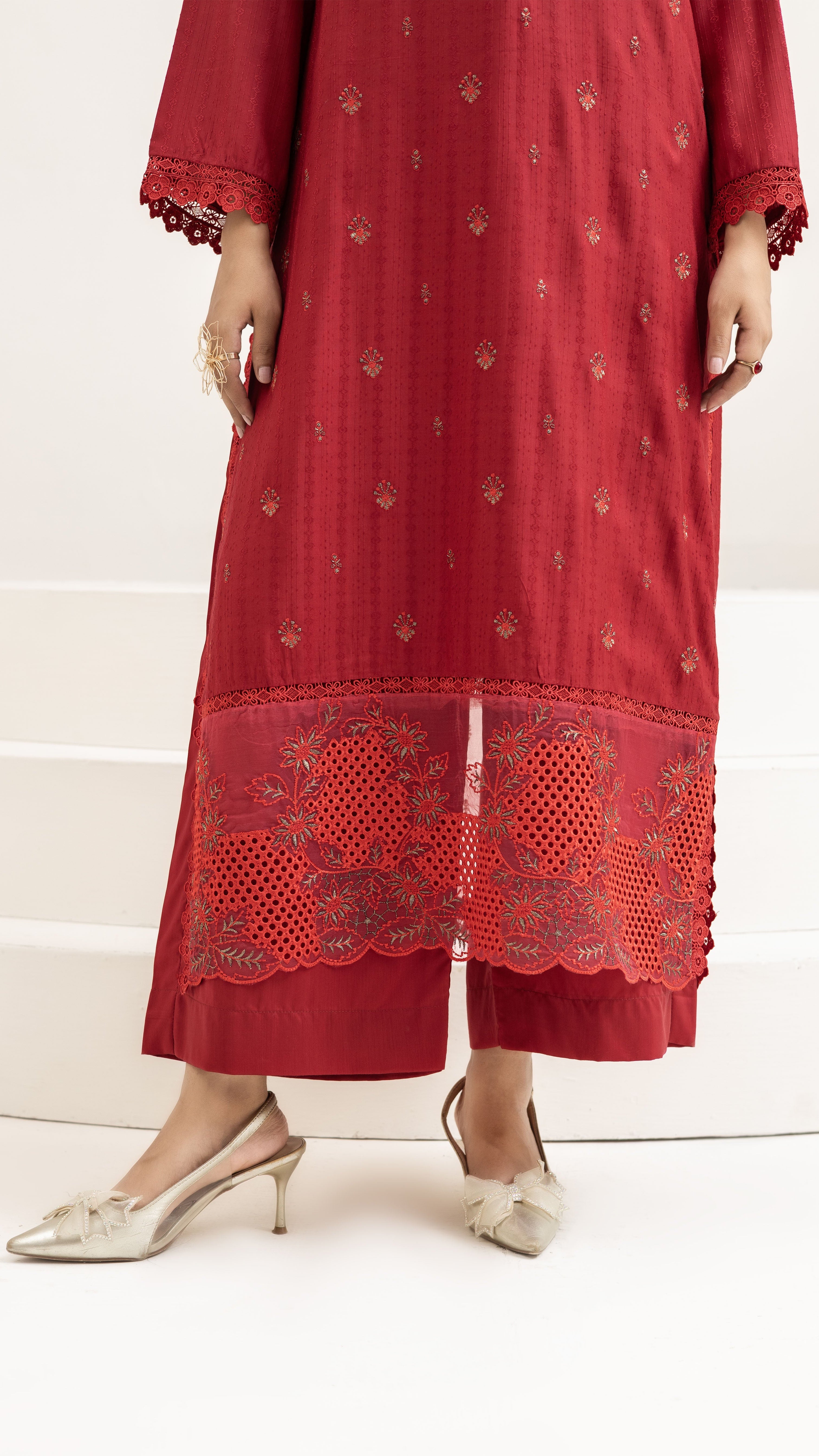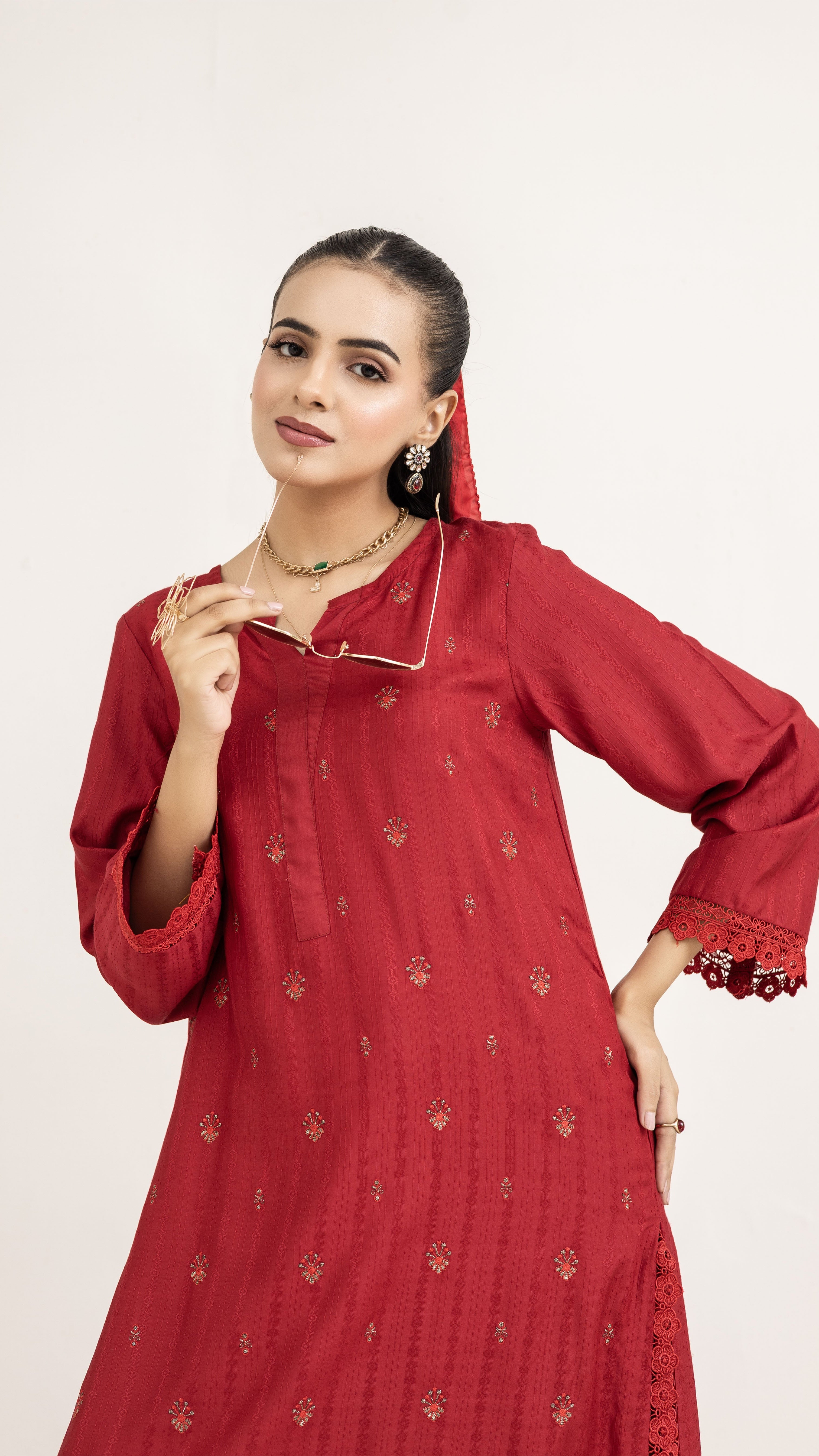 Step into timeless grace with this Red embroidered outfit, designed for refined sophistication and effortless charm. The shirt features delicate self-embroidered motifs all over, beautifully complemented with a lace-embellished hemline that adds a touch of femininity and class. The neckline is highlighted with intricate pearl detailing, enhancing its traditional appeal.