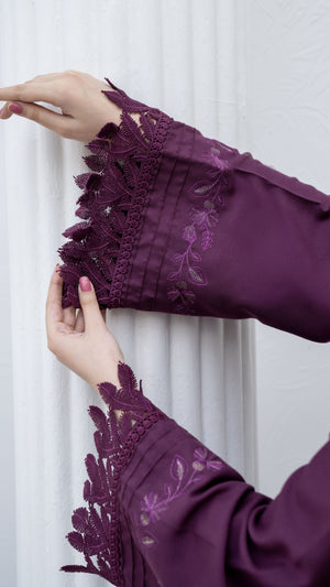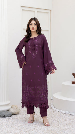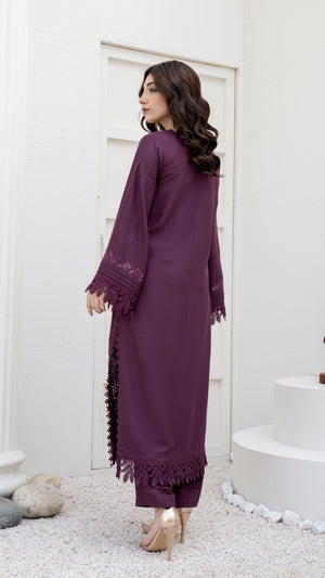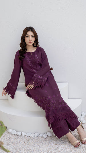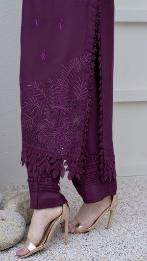 Radiate confidence and charm in this Purple embroidered outfit, a perfect blend of elegance and sophistication. The shirt features delicate tonal embroidery on the front and sleeves, beautifully enhanced with cutwork and lace detailing on the hemline for a refined finish. The embroidered cuffs add a graceful touch, making it ideal for festive and semi-formal occasions.