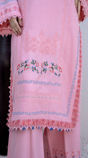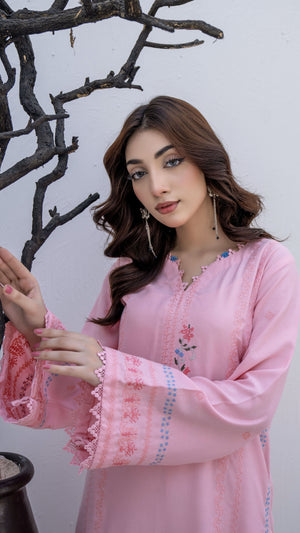 Radiate confidence and charm in this Baby Pink embroidered outfit, a perfect blend of elegance and sophistication. The shirt features delicate tonal embroidery on the front and sleeves, beautifully enhanced with cutwork and lace detailing on the hemline for a refined finish. The embroidered cuffs add a graceful touch, making it ideal for festive and semi-formal occasions.