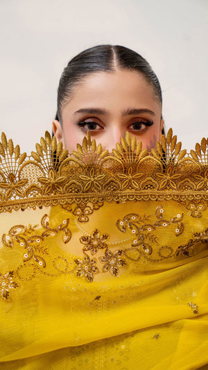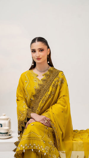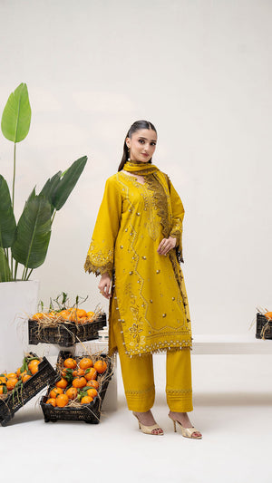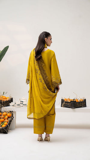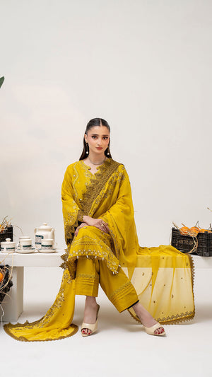 Add a graceful and sophisticated touch to your wardrobe with this Gold embroidered 3-piece suit, thoughtfully designed for elegance and everyday comfort. The deep Yellow shade is beautifully enhanced with delicate embroidery and fine detailing, giving the outfit a refined and timeless appeal. The neatly embroidered neckline and borders elevate the overall look, making it perfect for both festive wear and semi-formal occasions. Paired with a coordinated straight-cut trouser and an elegantly finished dupatta, this ensemble offers effortless style with comfort.