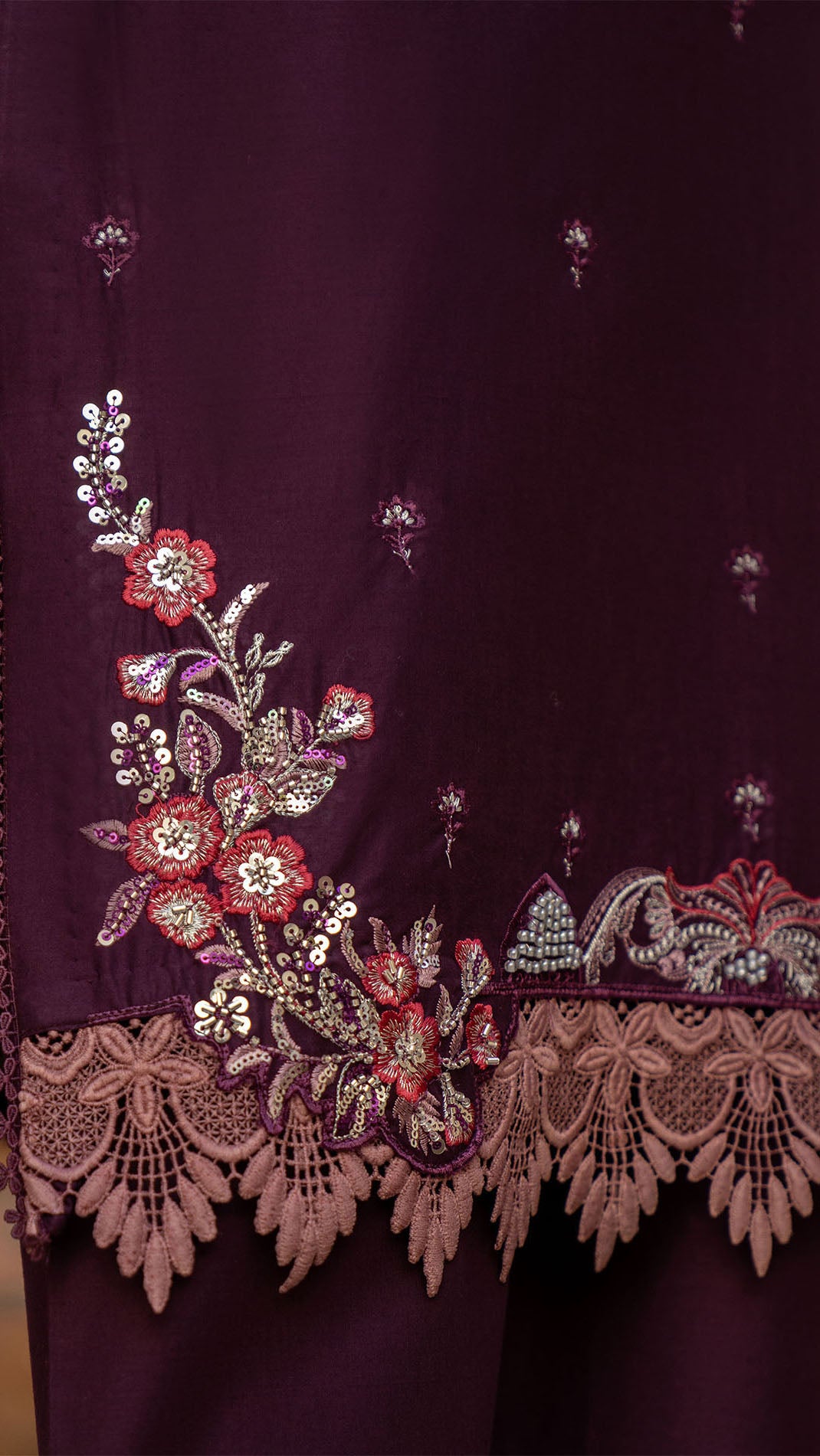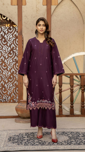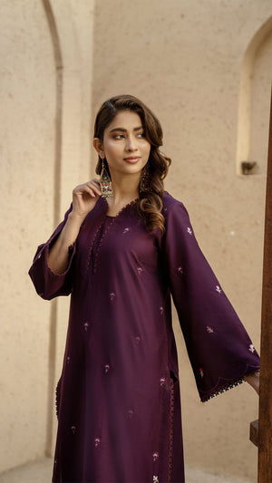 Make a refined style statement with this elegant Purple 2-piece suit, designed for effortless grace and timeless sophistication. The rich plum shade exudes luxury, while delicate embroidered motifs scattered across the shirt add subtle charm. Intricate floral embroidery along the hem enhances the overall look, giving it a graceful and feminine finish.