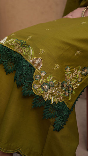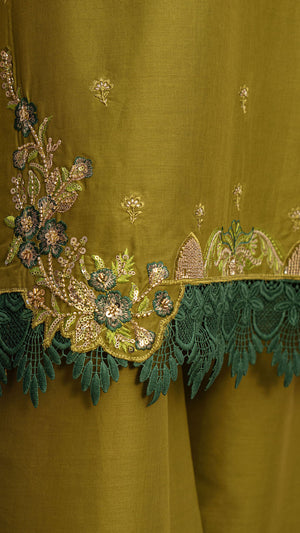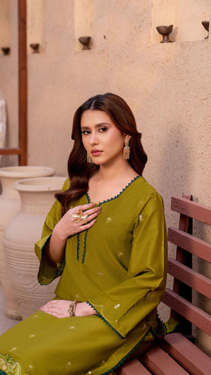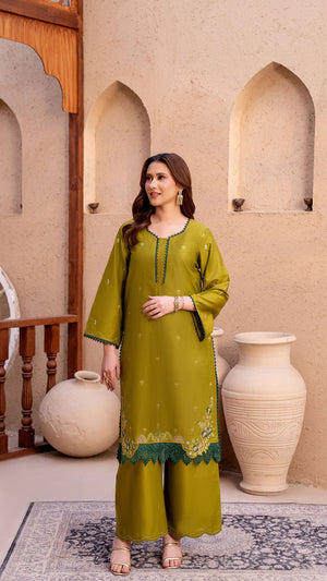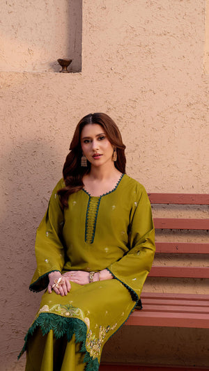 Make a refined style statement with this elegant Parrot Green 2-piece suit, designed for effortless grace and timeless sophistication. The rich Parrot shade exudes luxury, while delicate embroidered motifs scattered across the shirt add subtle charm. Intricate floral embroidery along the hem enhances the overall look, giving it a graceful and feminine finish.
