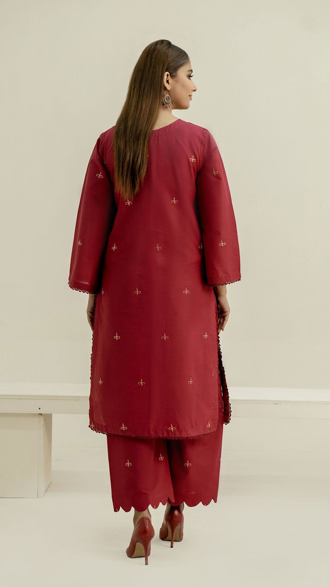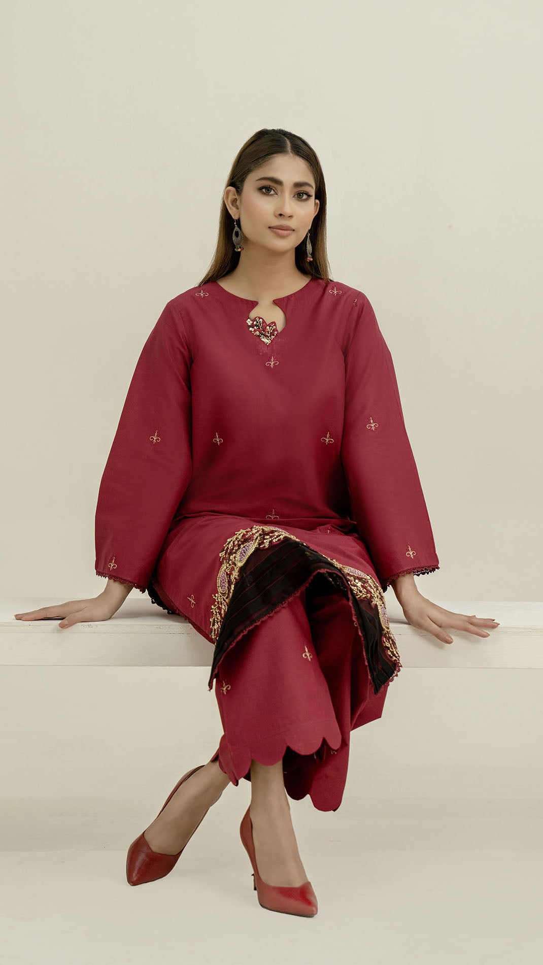The shirt features a clean, classic silhouette enhanced with minimal embroidered motifs, offering a balanced and polished look. Paired with matching straight-cut trousers finished with a stylish scalloped hem, this outfit is perfect for casual gatherings, daytime events, or semi-formal occasions.